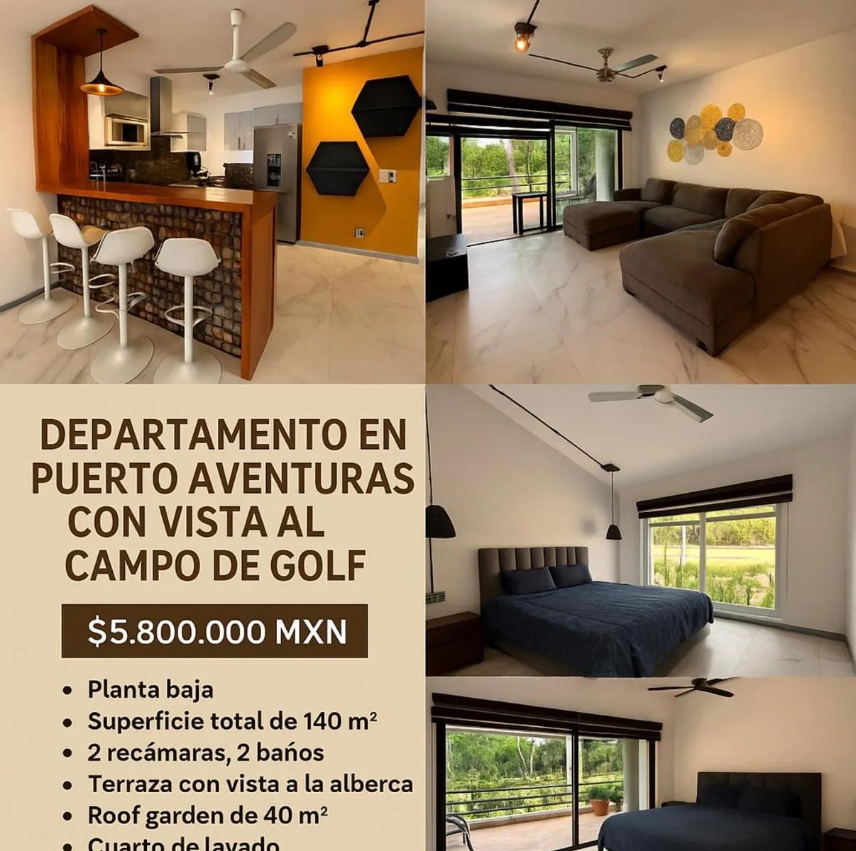 This beautiful apartment is located in the heart of Puerto Aventuras, one of the most exclusive and secure residential communities in the Riviera Maya. It features a modern design with unique details, such as a stone-accented bar and wood finishes, along with spacious, well-lit areas and an ideal layout.