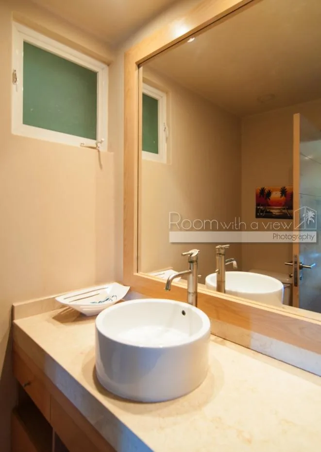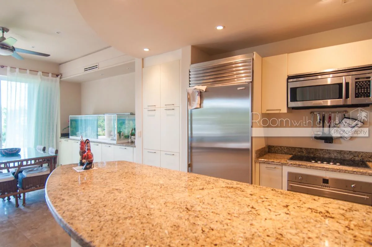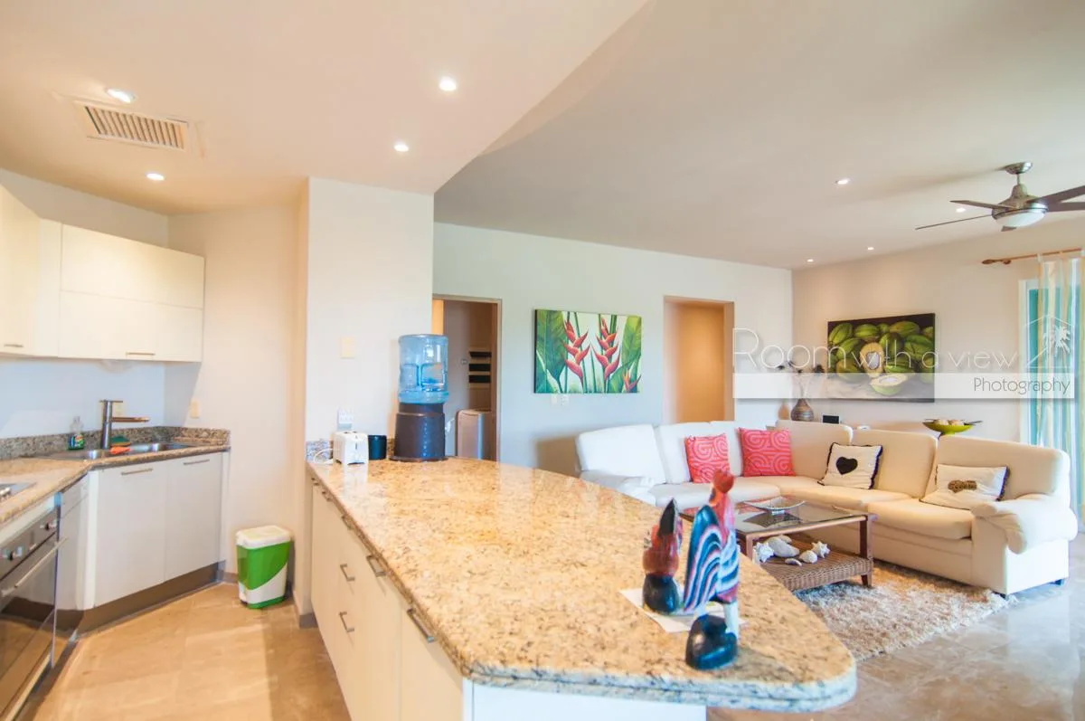 The two-bedroom residence features a spacious open floor plan that receives abundant Caribbean sunlight. The kitchen is equipped with modern appliances and includes a breakfast bar. The living area opens onto a large outdoor terrace that contains a Jacuzzi.