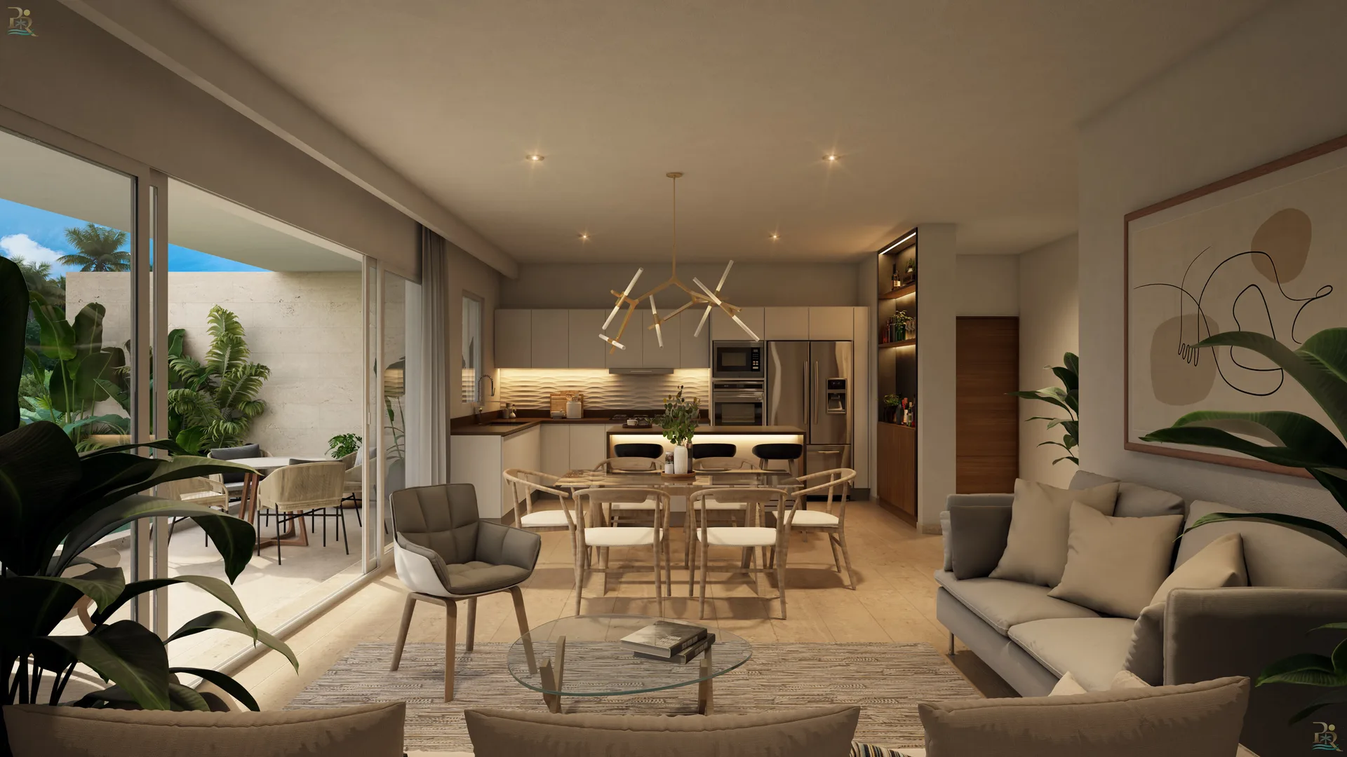 Each unit contains carefully selected high-quality materials and modern designer elements. These include a high-gloss MDF kitchen with quartz countertops, faucets by Helvex or similar, appliances by TEKA or equivalent, cabinets and doors made of tzalam wood (or similar), white PVC windows, and energy-efficient mini split inverter air conditioning systems.