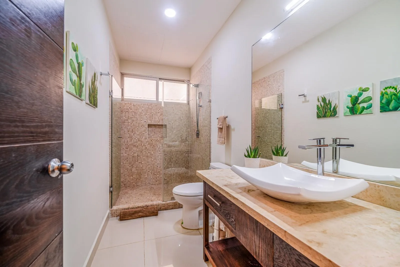 The residence features two bedrooms, each with a private bathroom. A generous open-plan layout combines the living, dining, and kitchen areas, ideal for relaxation and entertaining. A large private terrace provides lush views of the pool, gardens, and the fairways of the Puerto Aventuras golf course.