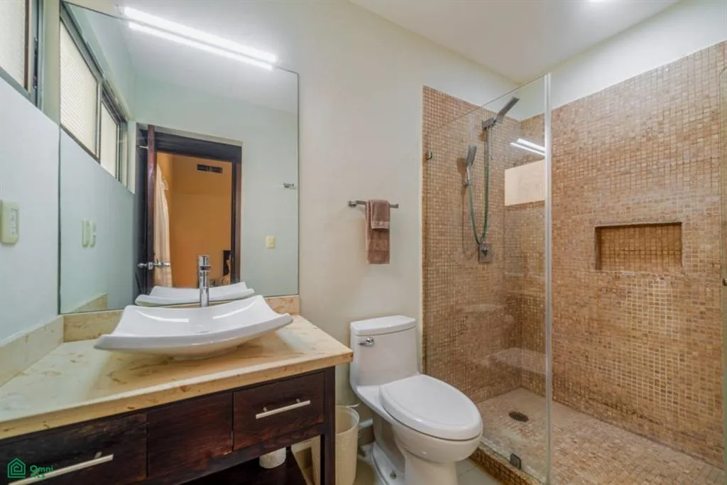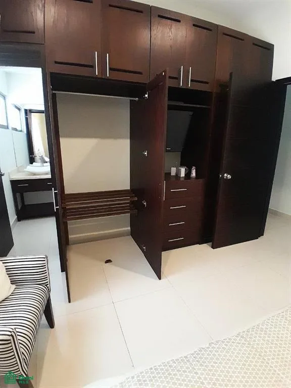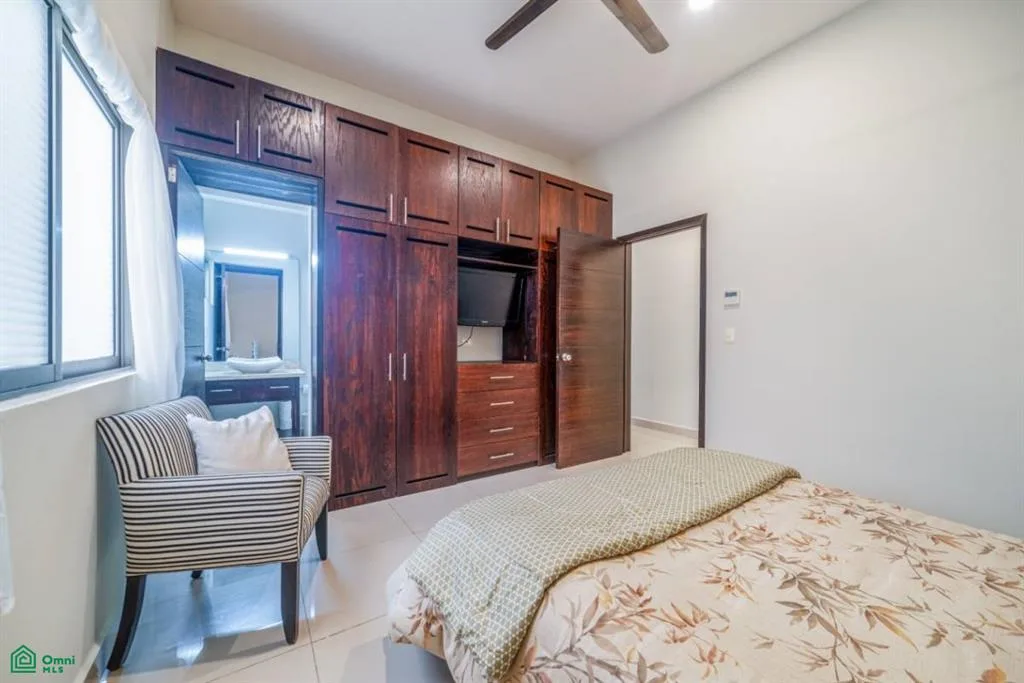 The residence features two bedrooms, each with a private bathroom. A generous open-plan layout combines the living, dining, and kitchen area, ideal for relaxation or entertaining. A large private terrace provides lush views of the pool, gardens, and the fairways of the Puerto Aventuras golf course.