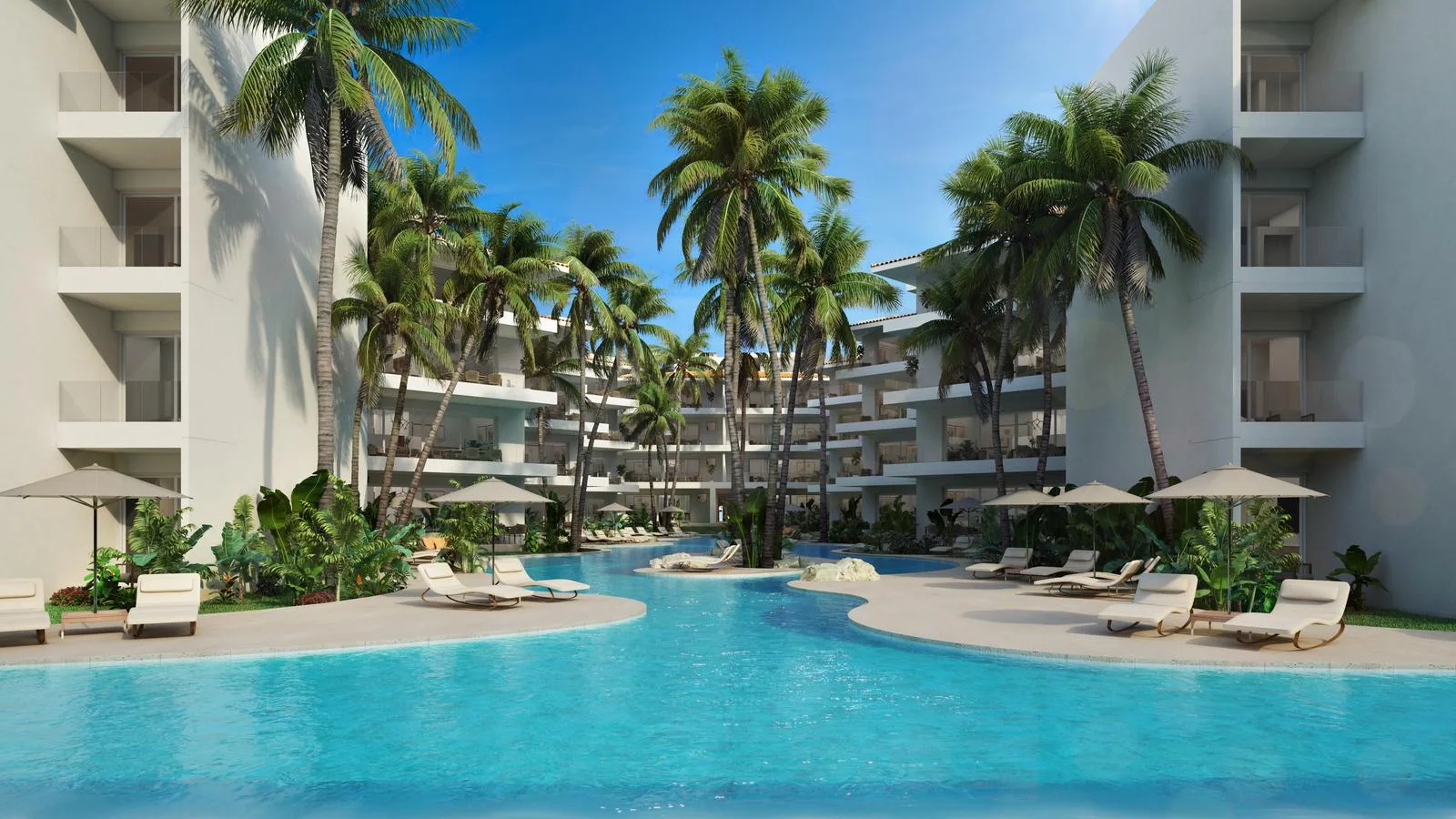 Amenities include an extensive pool with islands and artificial beaches, access to a beach club, and a location facing the marina.