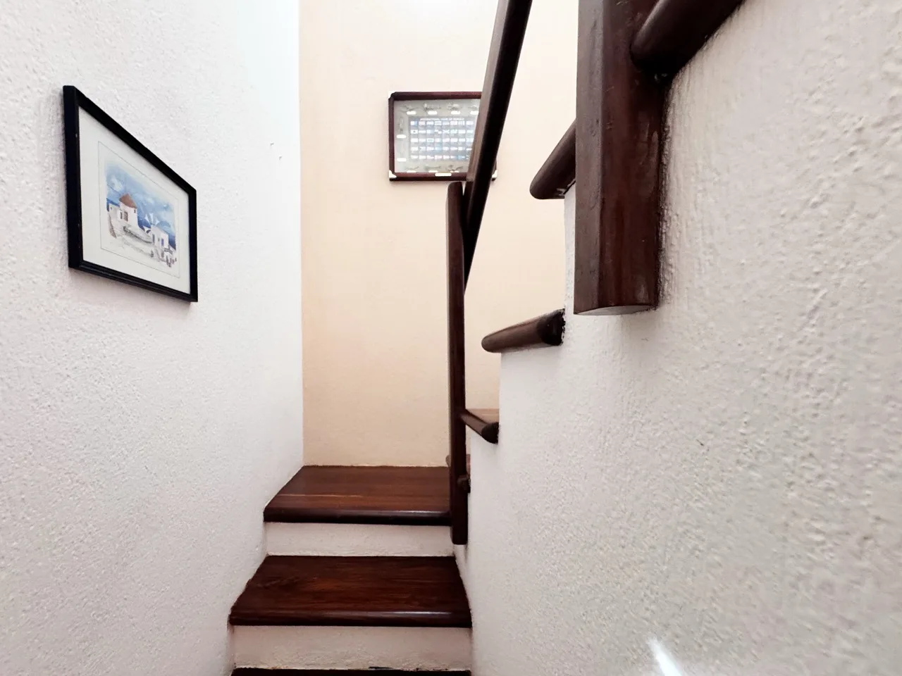 The home includes a service quarters area with a kitchenette. The ground floor contains two bedrooms, while the private master suite is situated upstairs. The living spaces are defined, with an enclosed kitchen and a screened terrace.