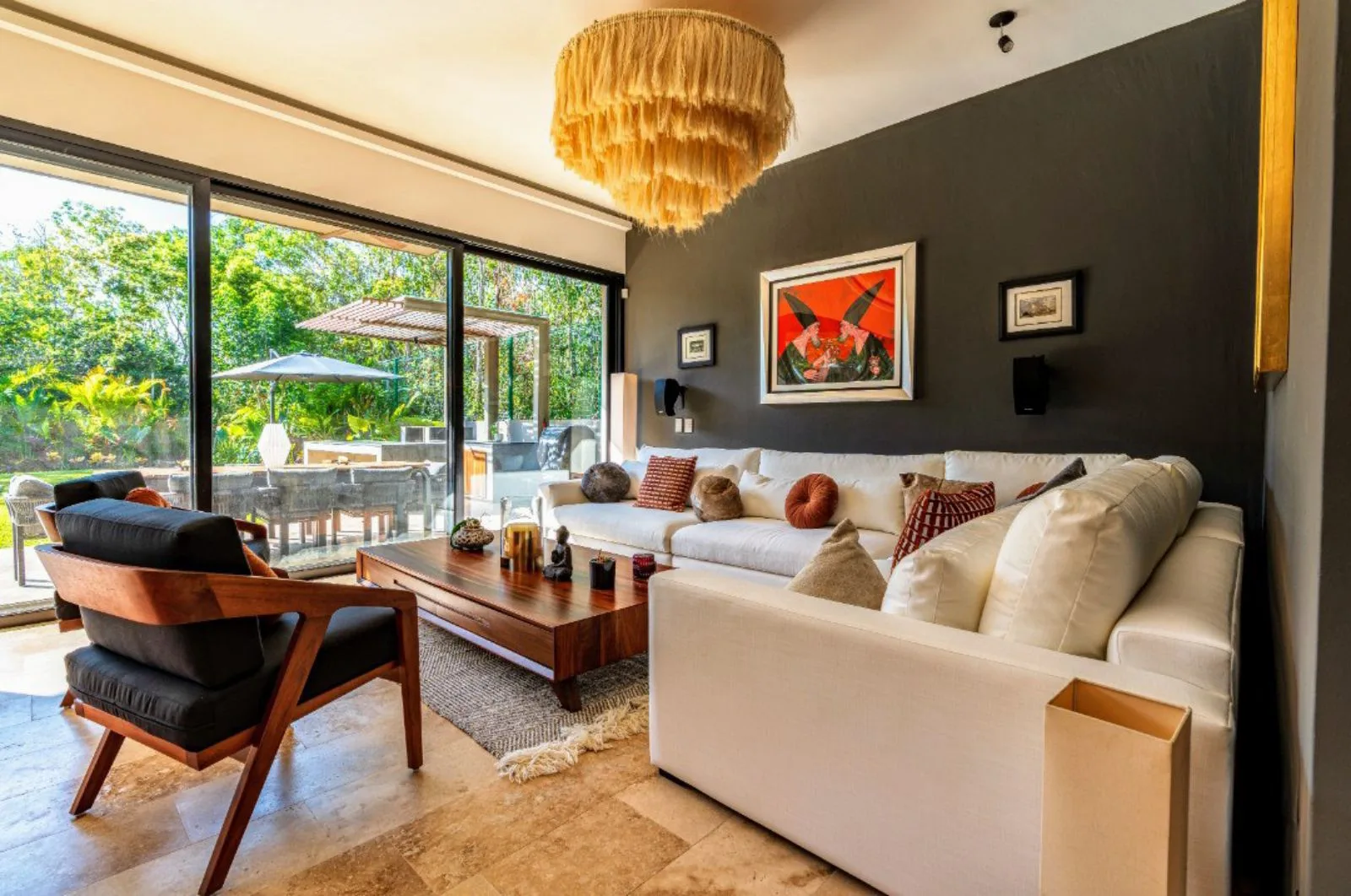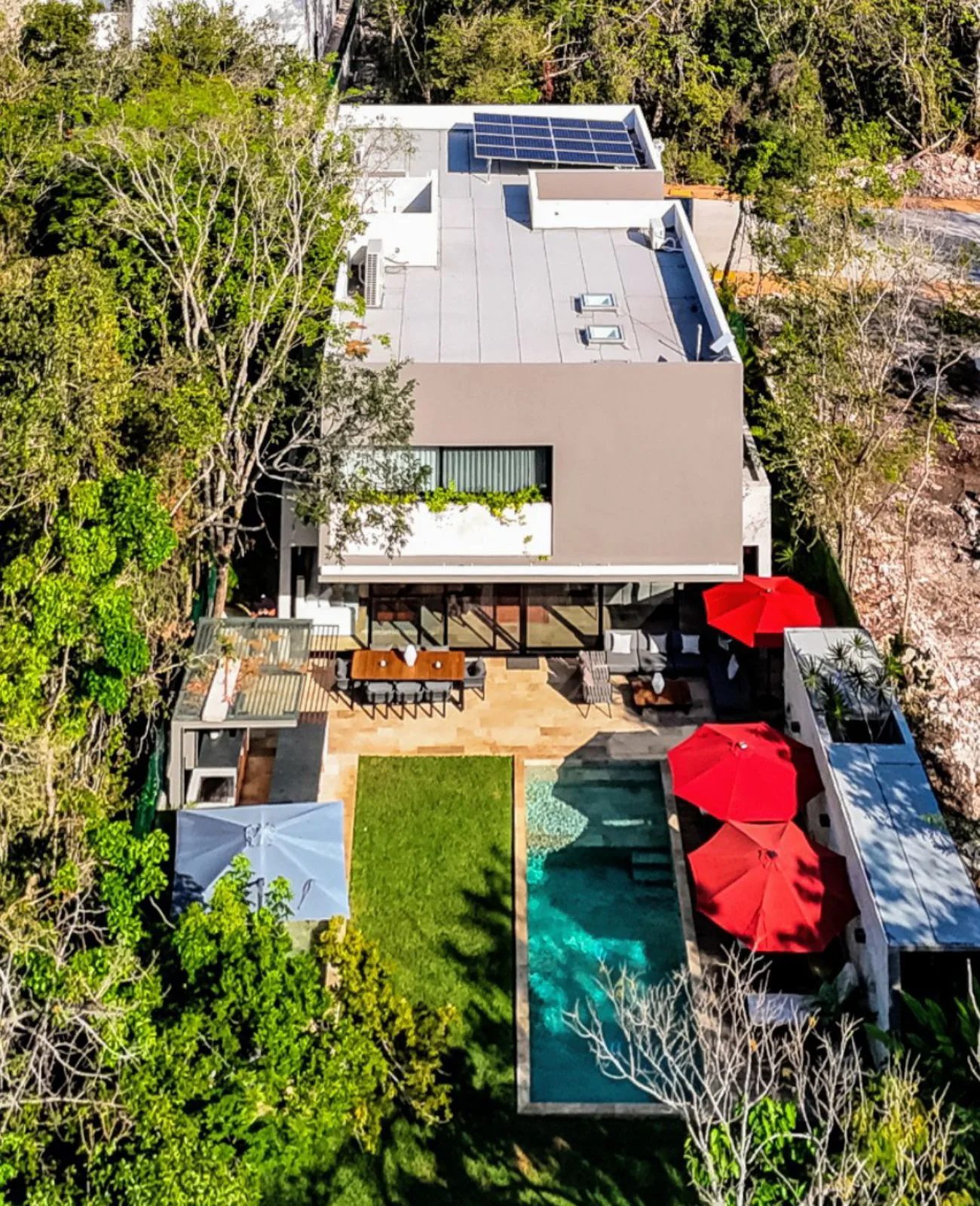 Amenities include a private gym, solar panels, an automated irrigation system, a water purification system, an alarm system, and 24/7 security. The home features comprehensive smart home automation technology.