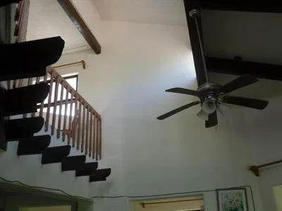 The property features double-height ceilings, marble floors, and views of the golf course. The main level includes a spacious living and dining room with travertine marble floors. Sliding doors open to a covered patio surrounded by trees and tropical gardens, offering views of the golf course. Adjacent to this area is a room that can be used as a guest bedroom or office, complete with a private bathroom and closet.