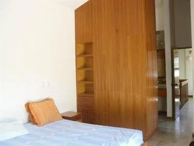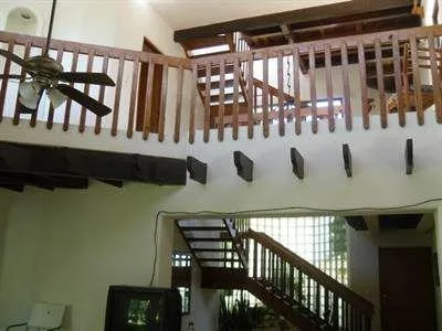 The kitchen is spacious and filled with natural light. It is connected to a laundry area and a staff room with a private bathroom. Access to the upper floor is via a wooden staircase leading to the primary bedroom, which features a double-height ceiling and two large glass sliding doors that open to a generous terrace overlooking the garden. This suite includes a walk-in closet and a private bathroom with a bathtub and shower.