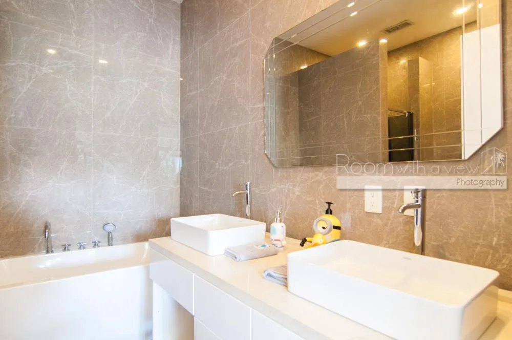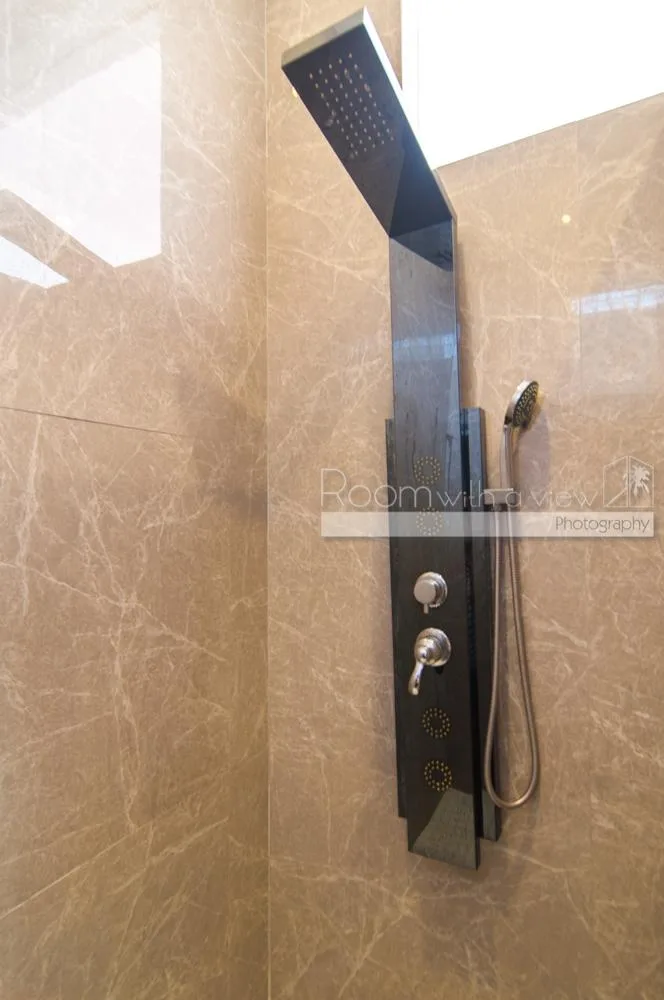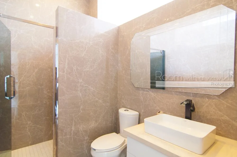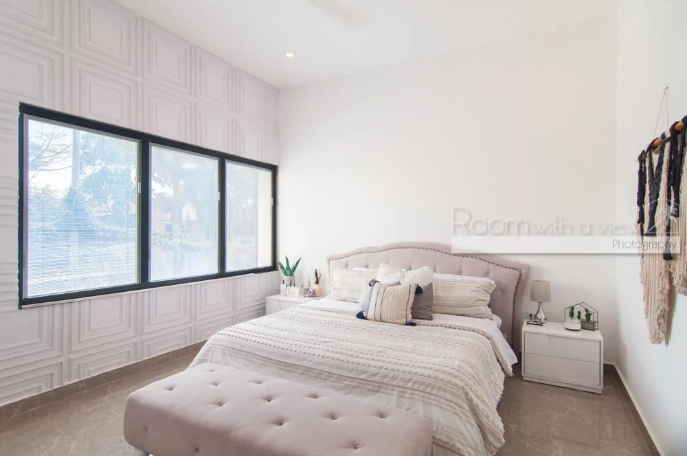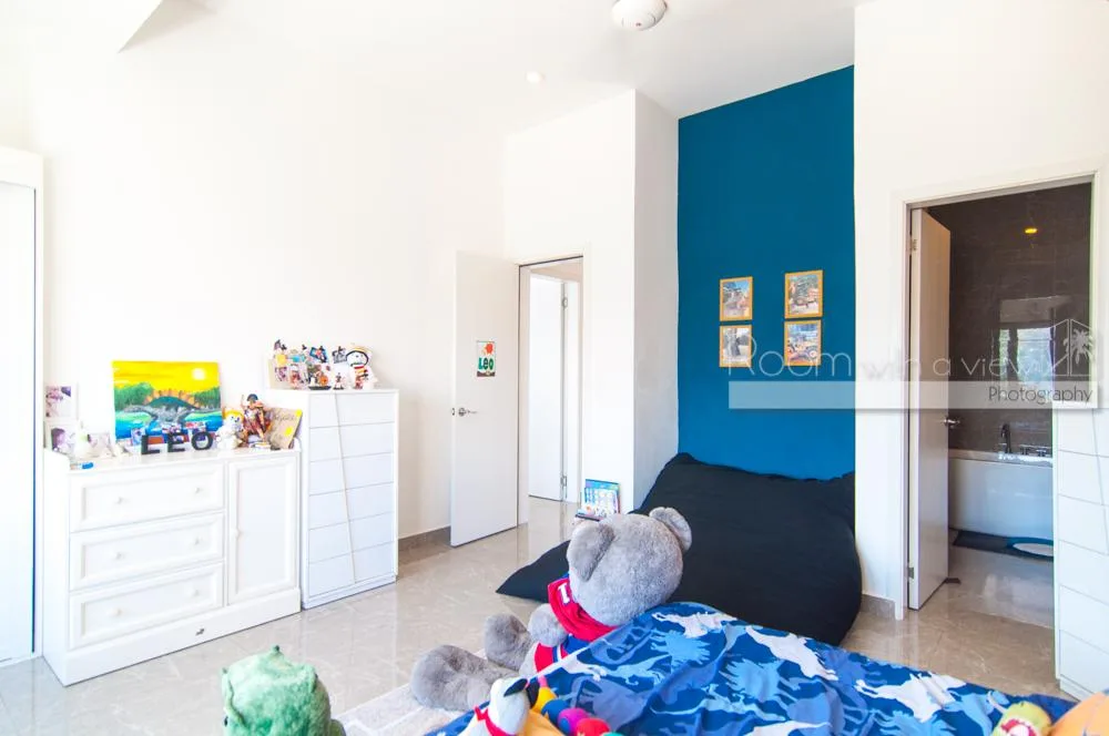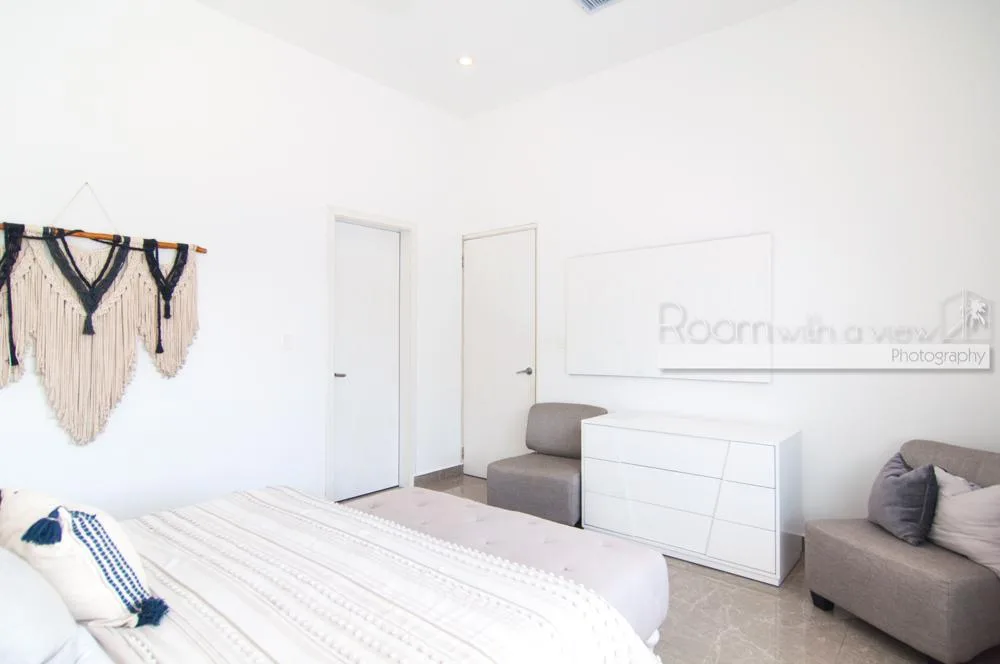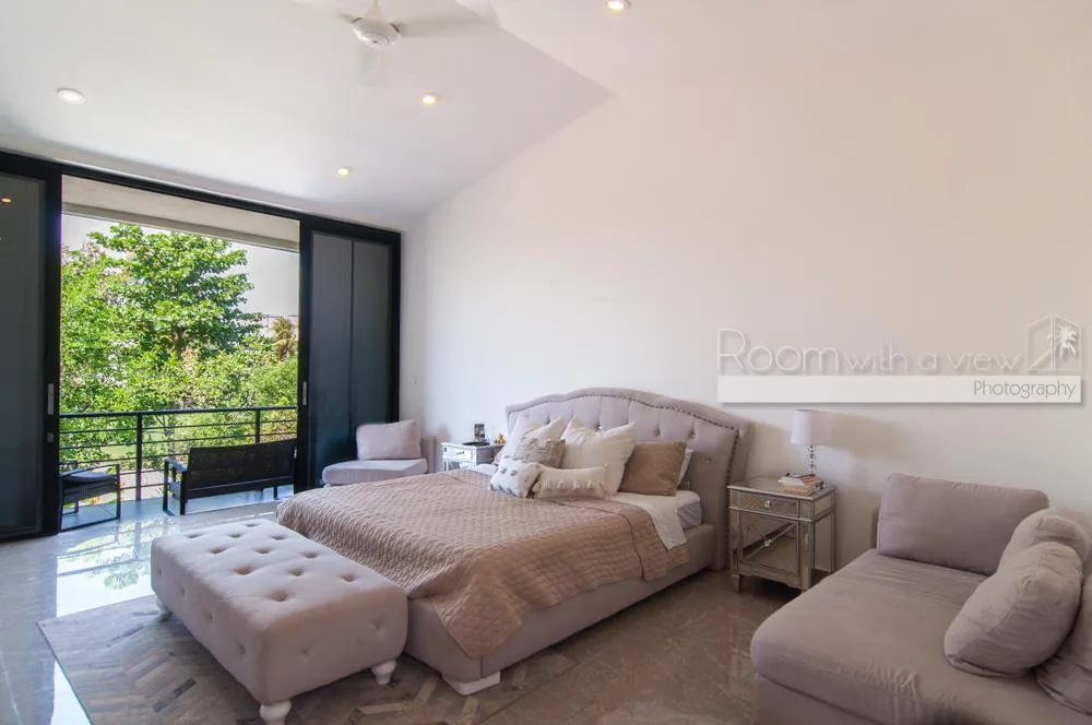 The primary suite includes a private balcony, a walk-in closet, and an en suite bathroom. The property is fully walled for privacy and security.