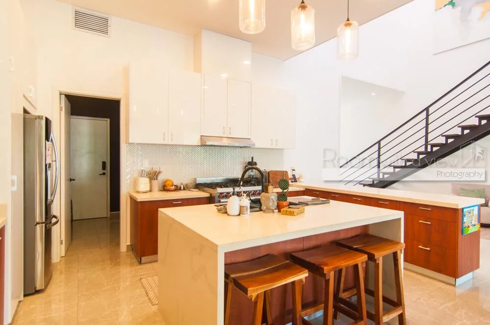 This two-story home features four bedrooms and three bathrooms. It has an open-concept layout with cathedral ceilings. The living and dining areas connect to a screened-in patio that opens to a private backyard with a pool and an outdoor grill area.