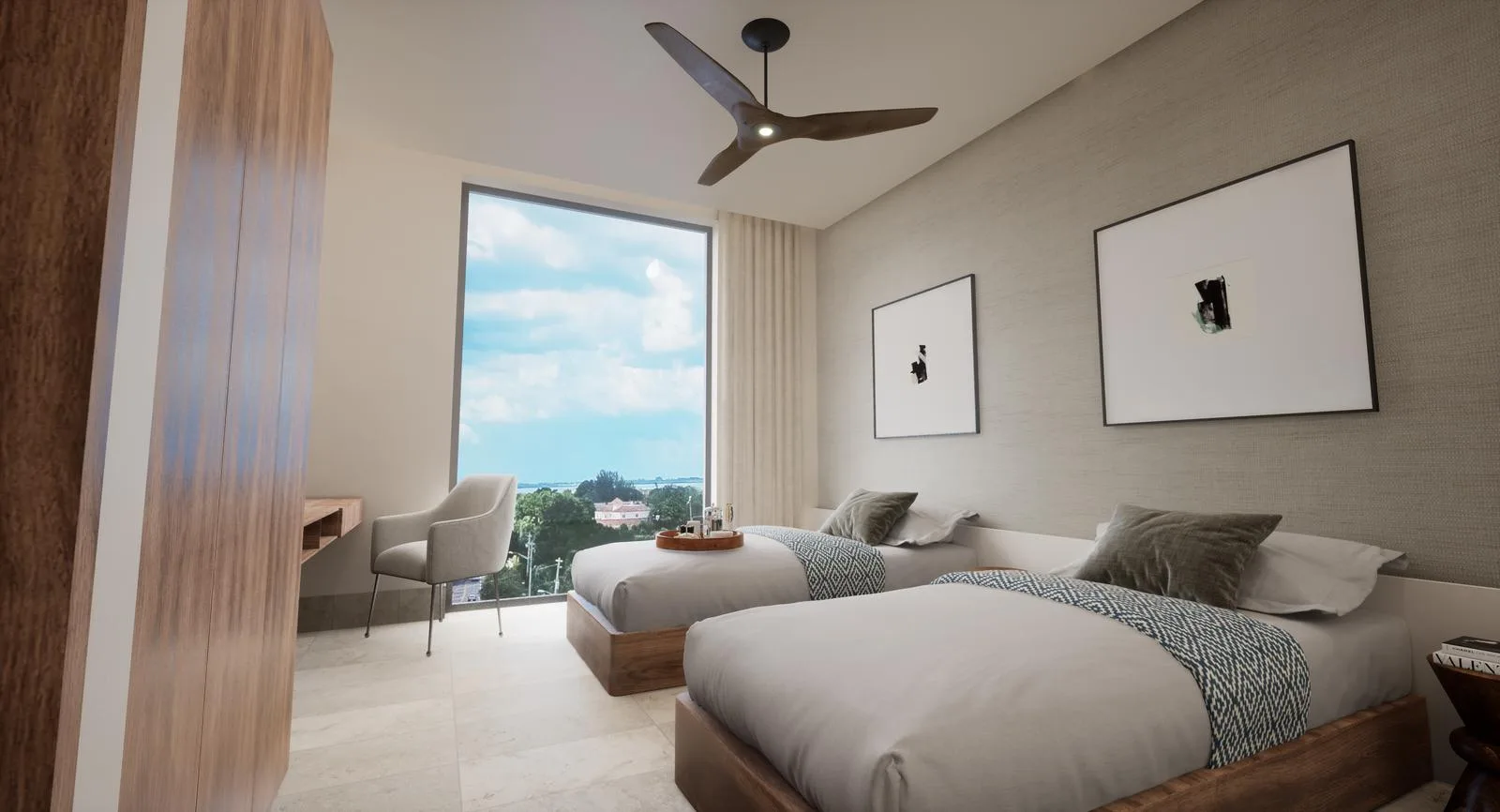 The residence features three spacious bedrooms, each with an en-suite bathroom. An open-concept living area includes a family room or TV lounge. The kitchen is fully integrated with a contemporary design and premium finishes. Large windows and balconies provide panoramic views of the Caribbean Sea. The private rooftop is suitable for a lounge area, grill, or jacuzzi. The unit includes an internal laundry area and a storage room.