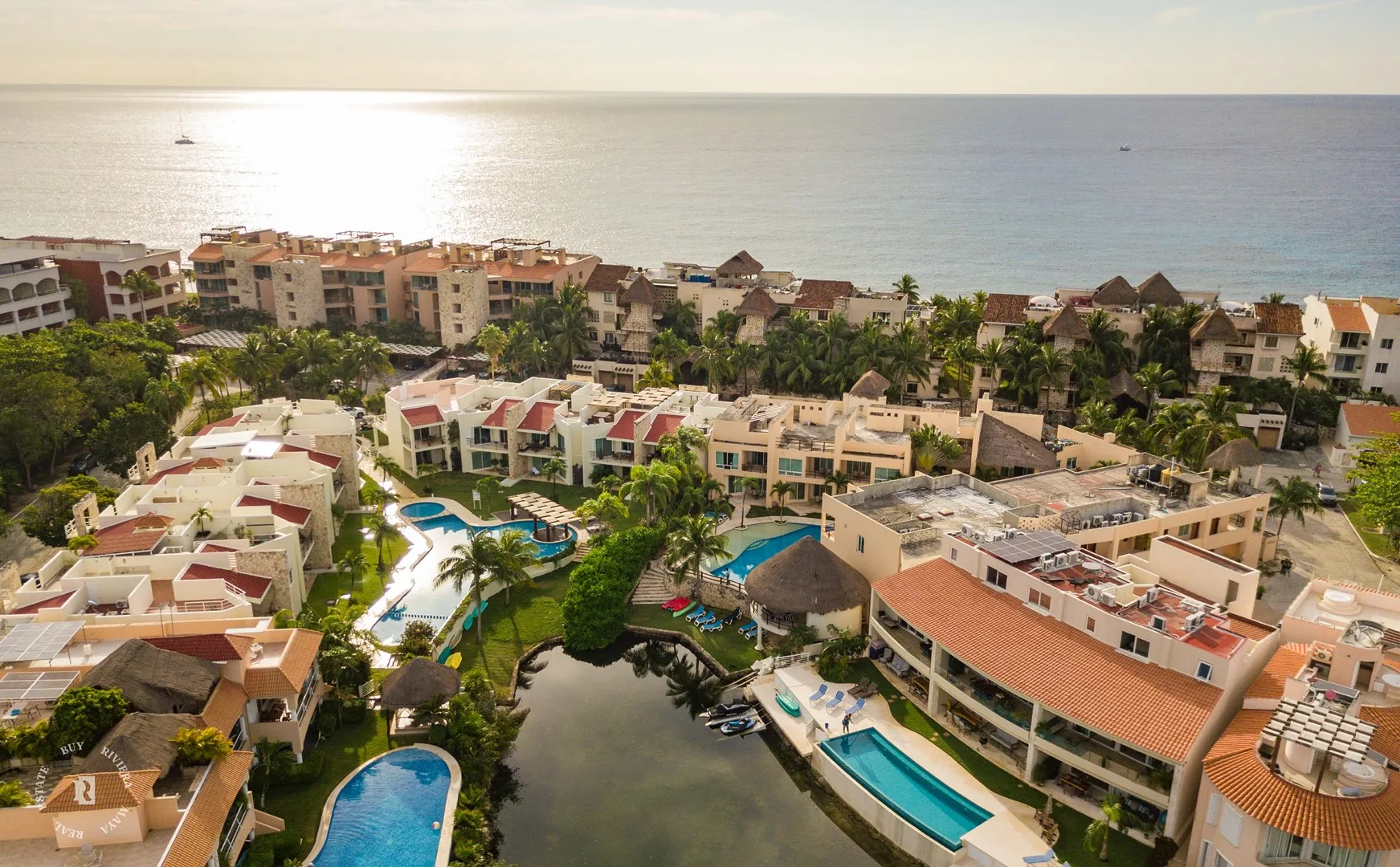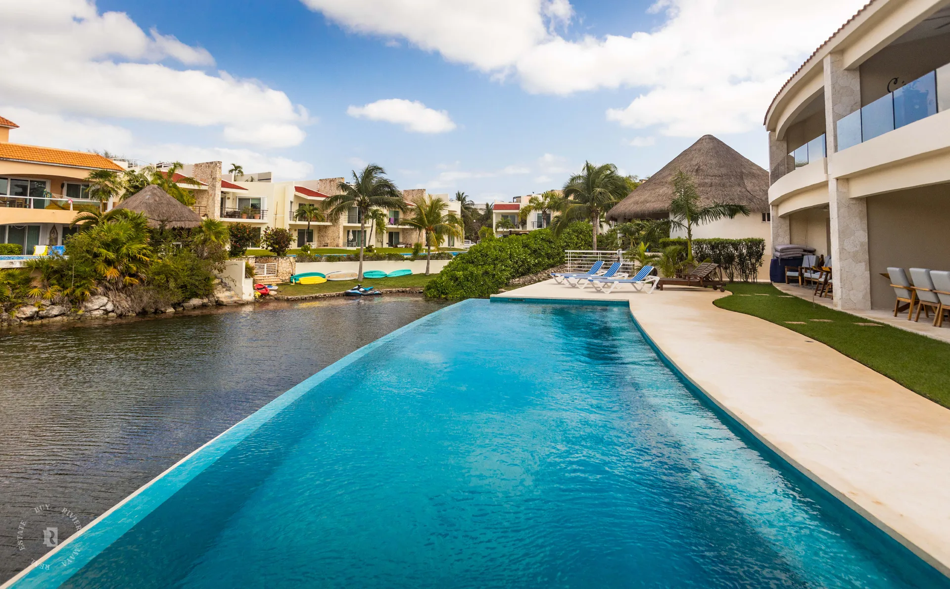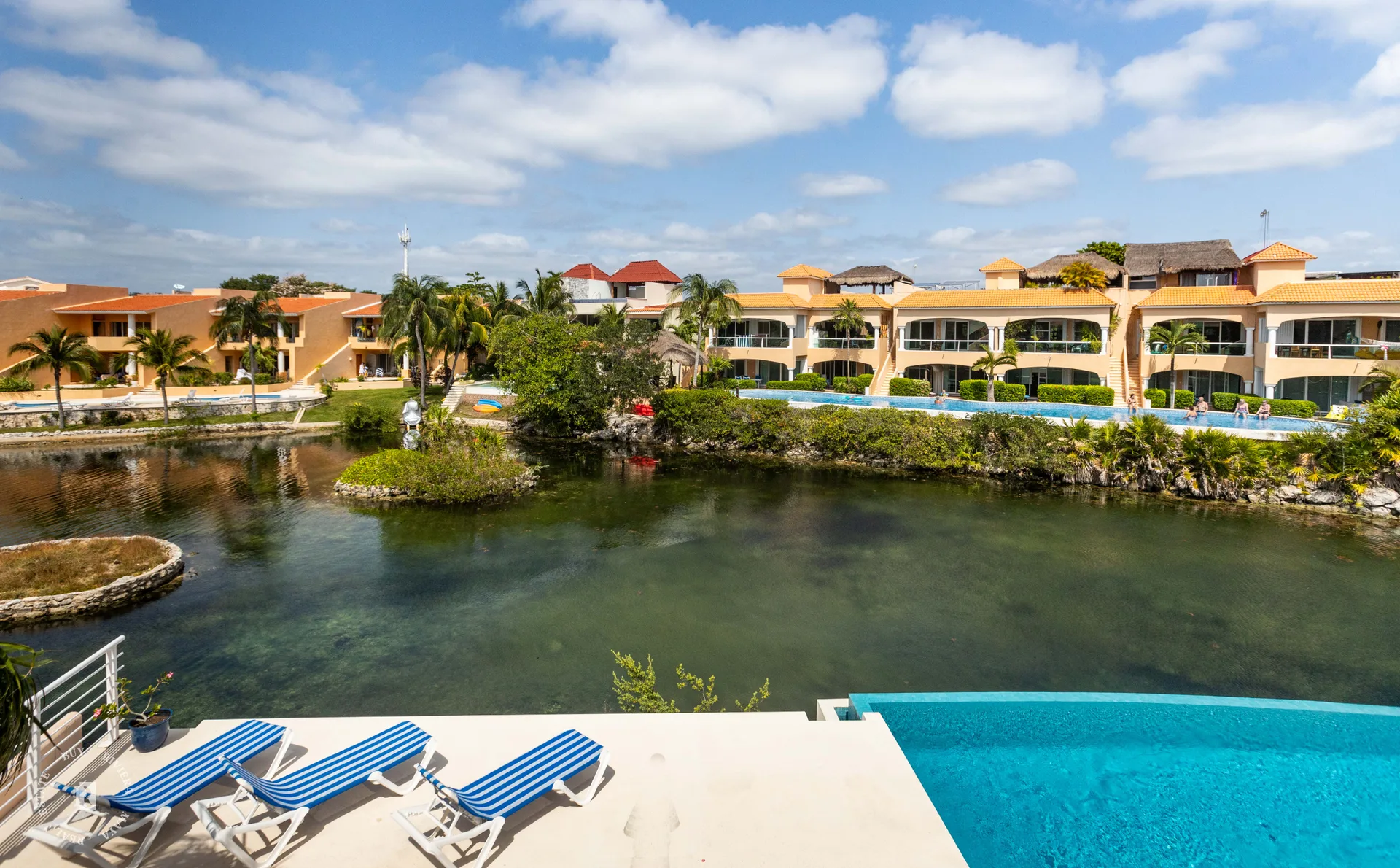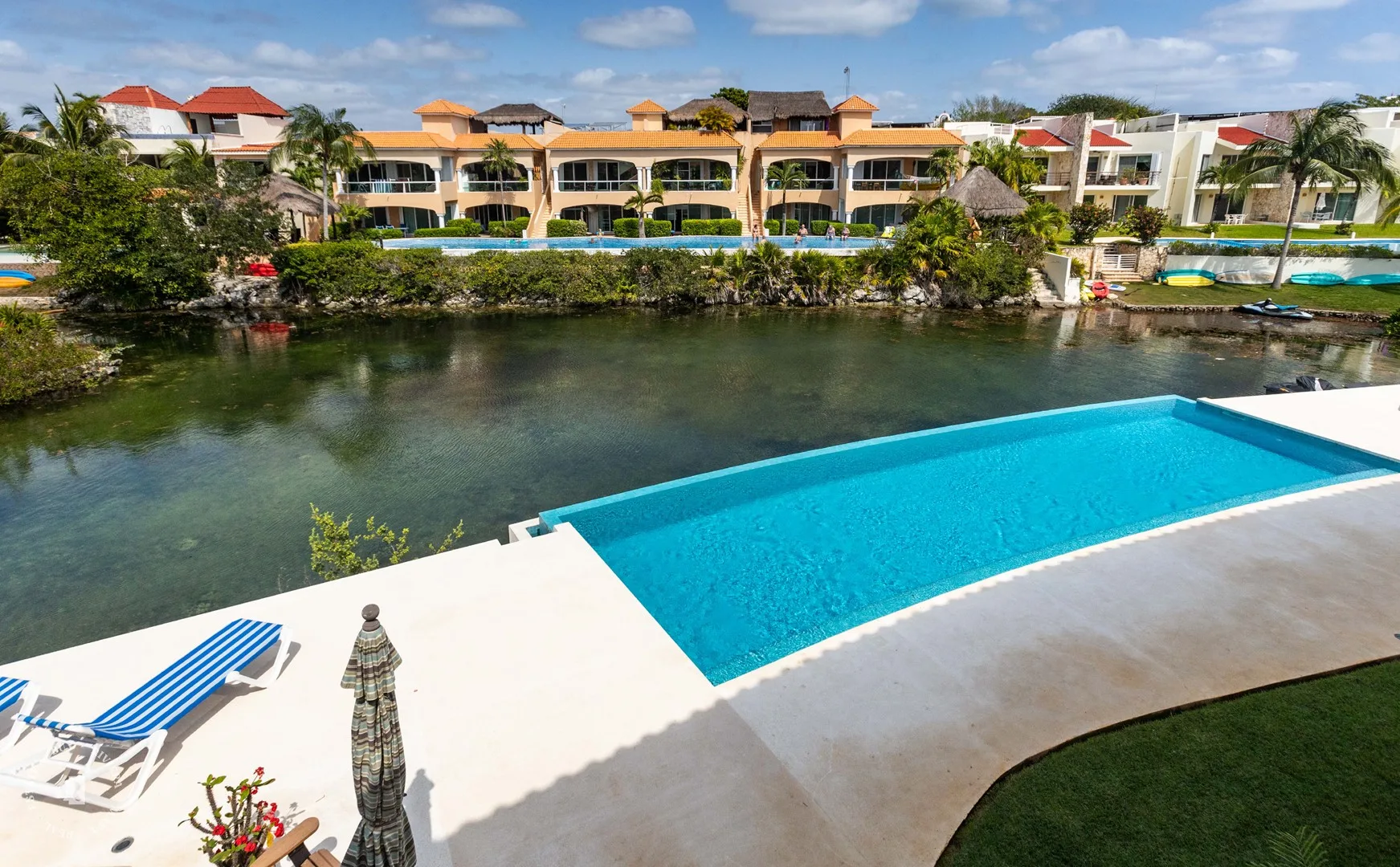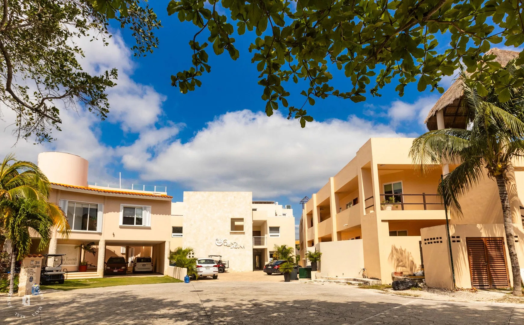 Quinta Laguna is a boutique development with only 6 units, built in 2020. It is located by the lagoon in the exclusive gated community of Puerto Aventuras. The complex faces the lagoon and is connected to the beach by a canal suitable for swimming, paddling, or kayaking. The community includes a golf course, a tennis club, and a commercial zone with restaurants, shops, a dolphin experience center, skate parks, and a cultural zone.