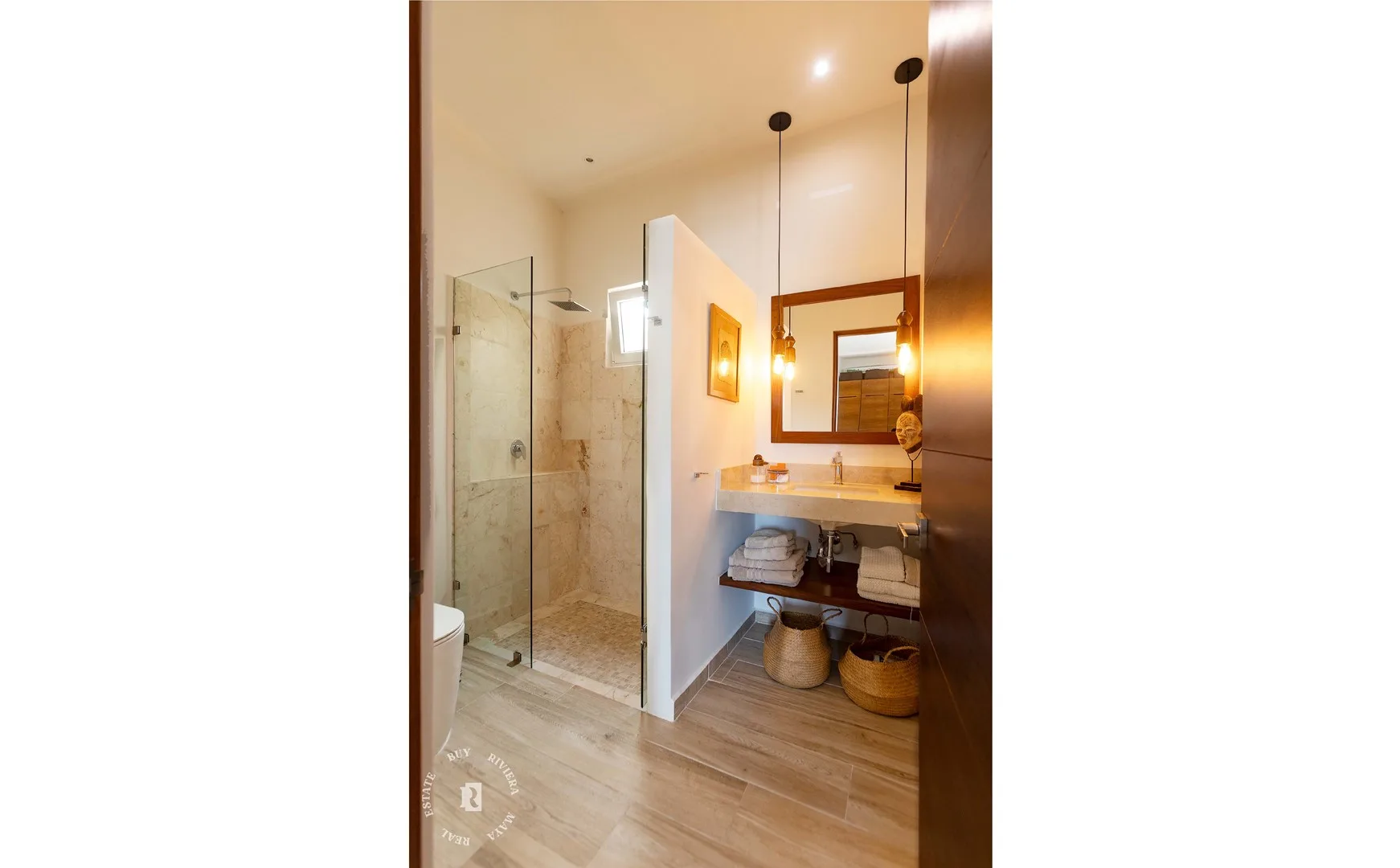 The upper level is dedicated to the master bedroom, which contains a king-size bed, a walk-in closet, and a large bathroom with high mirrors. All light fixtures in the penthouse were carefully selected. The property includes enough space to create a third bedroom with a water view and terrace.