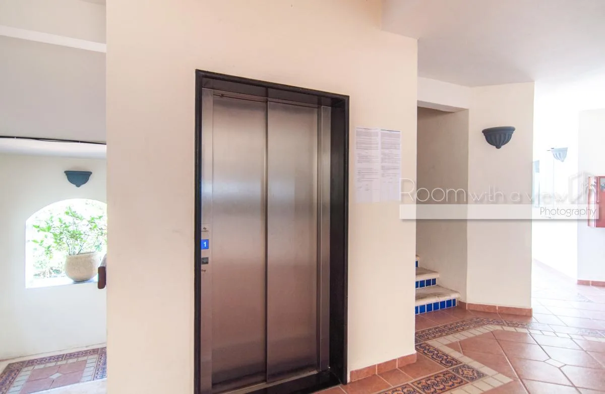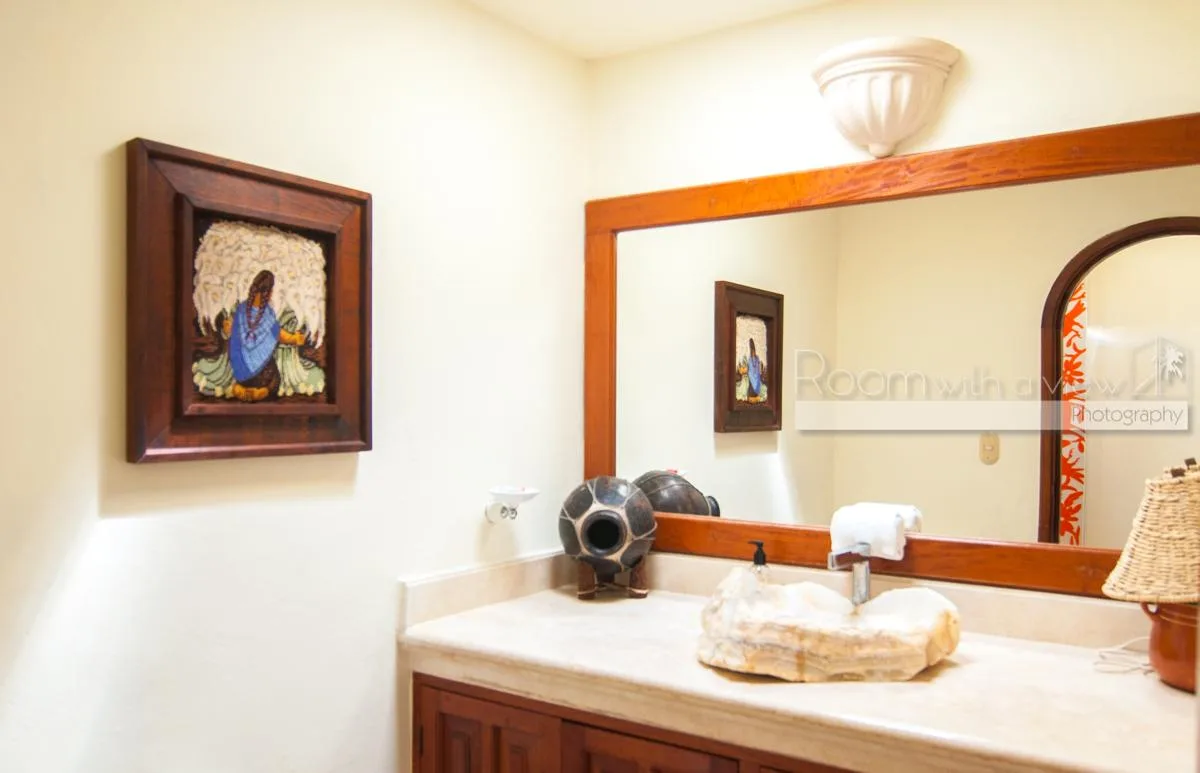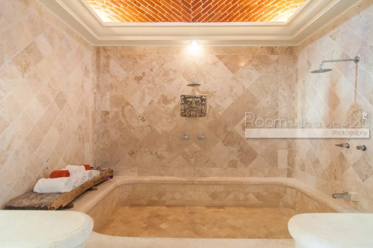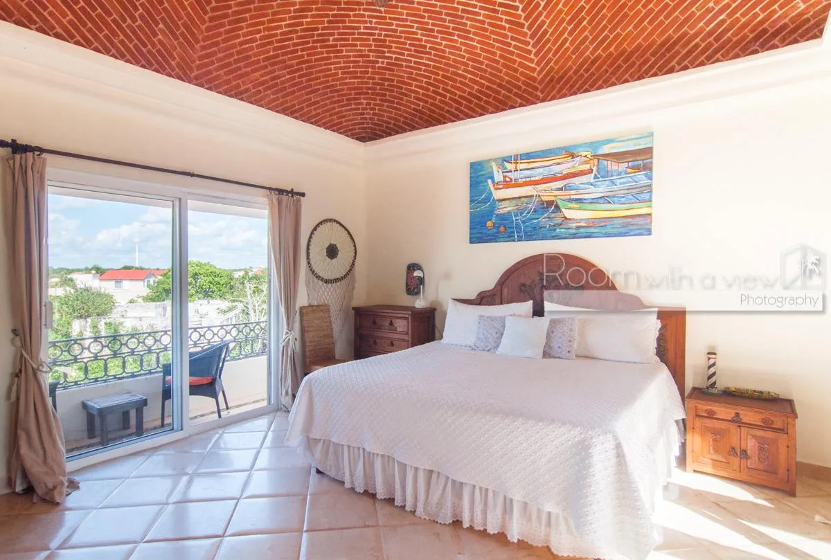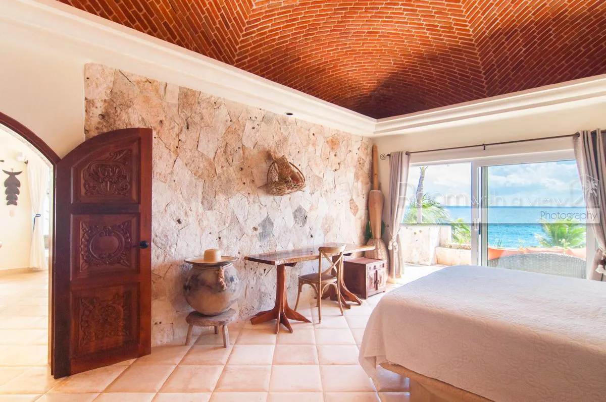 This oceanfront condo is situated on the top floor within a gated resort community in Puerto Aventuras. The residence features cathedral ceilings, skylights, and arched doorways. Intricately carved wood doors and high-end finishes are found throughout.