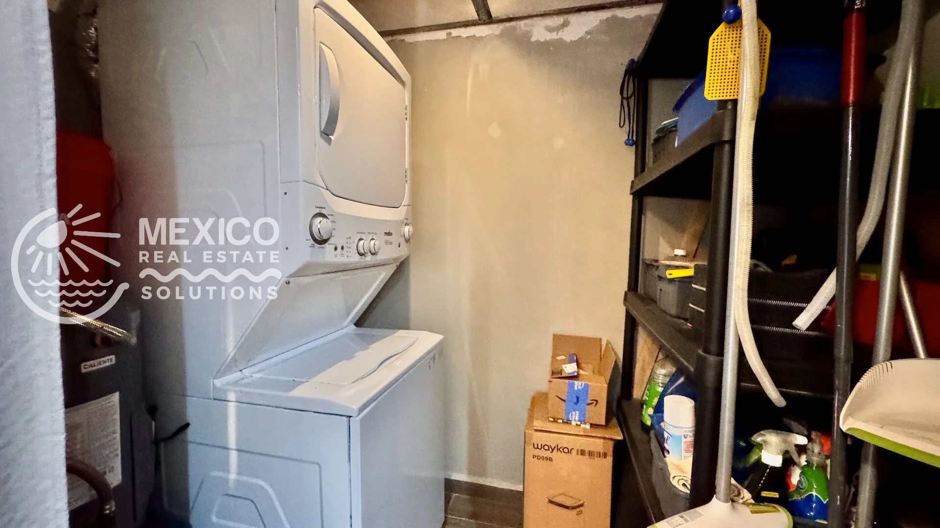 The interior includes a cozy living and dining area with an open kitchen. Both bathrooms are full, and the home features a walk-in shower with a natural pebble mosaic. The unit is equipped with in-suite laundry facilities and a storage closet. There are no monthly homeowners association fees.