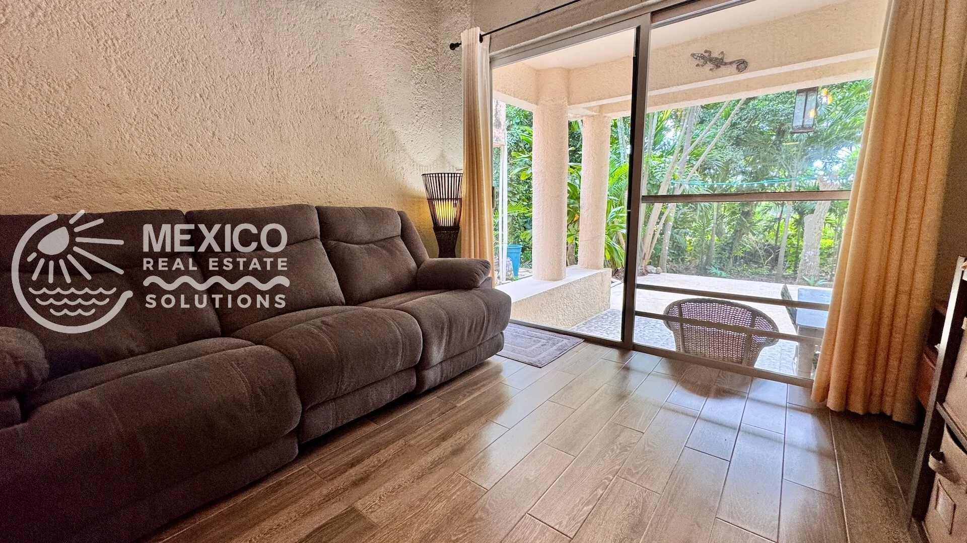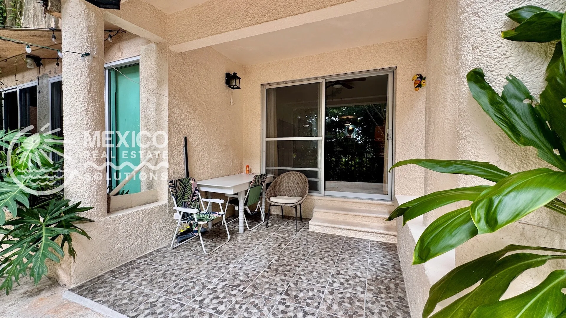 This charming 2-bedroom, 2-bathroom townhome is fully furnished and ready for immediate occupancy. It is located in a gated community within Puerto Aventuras. The property features a private covered terrace that faces a peaceful par-3 golf course.