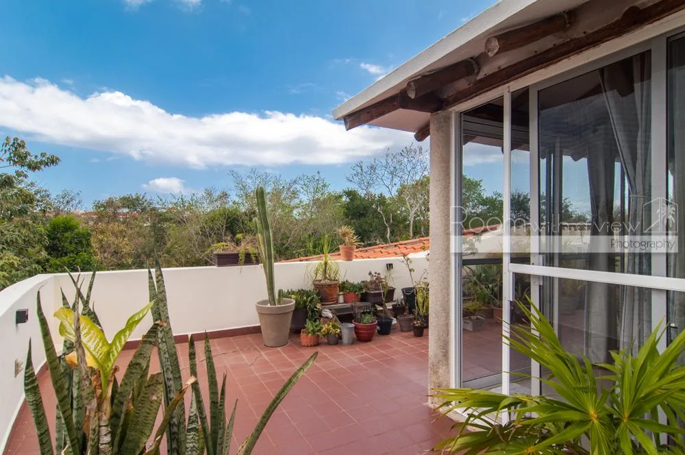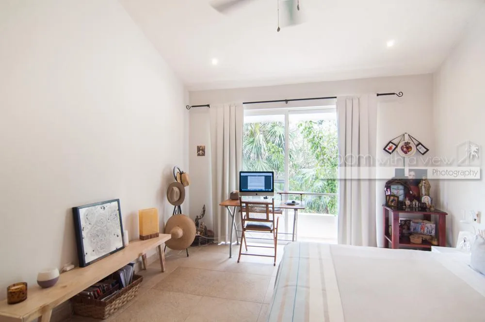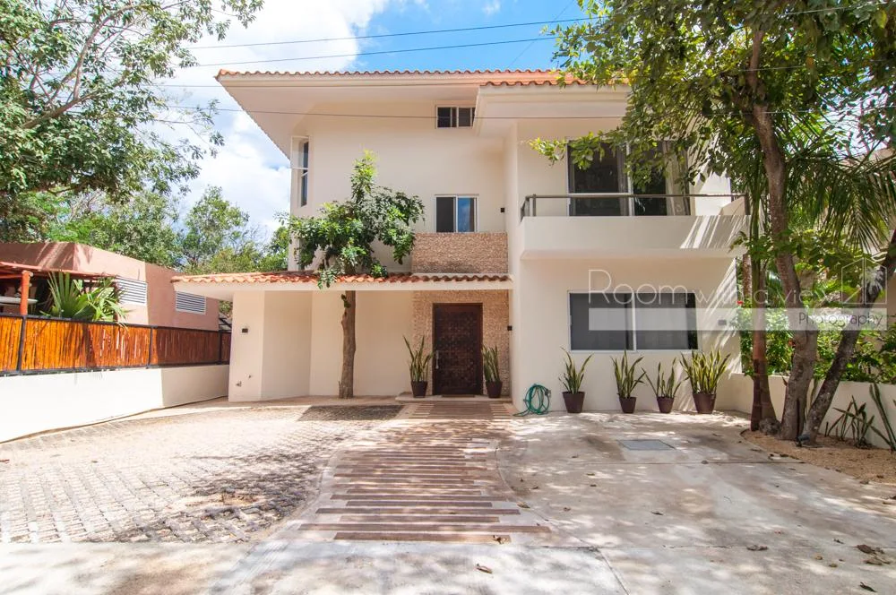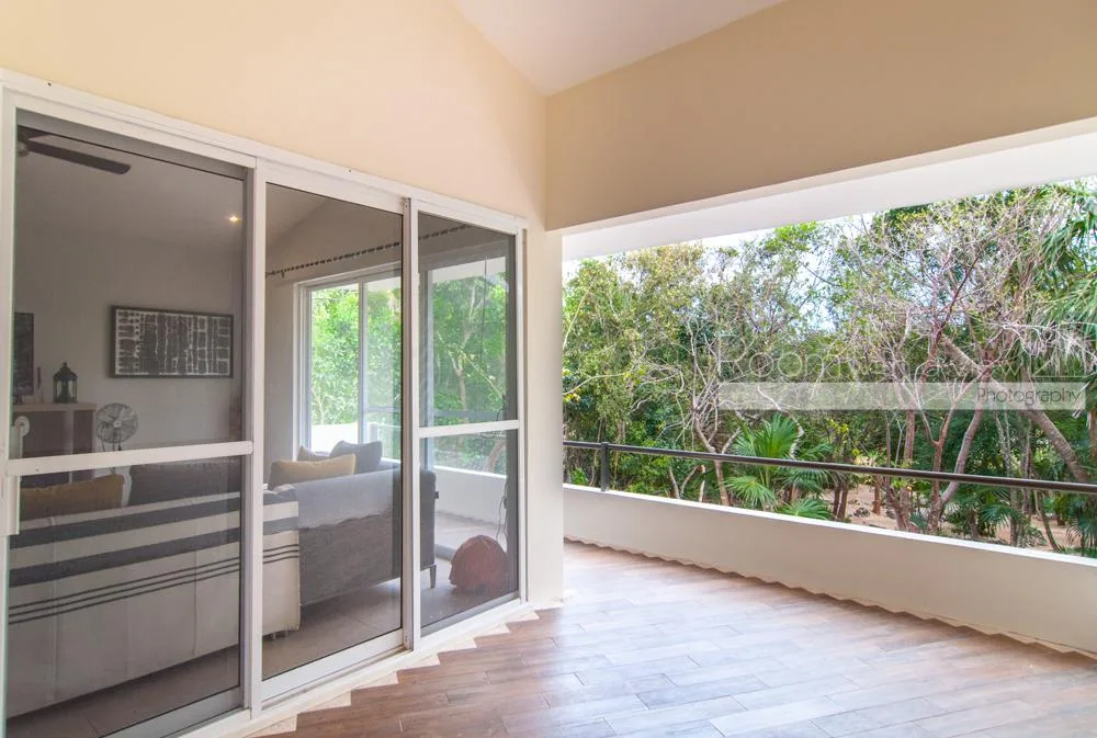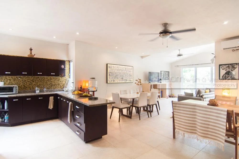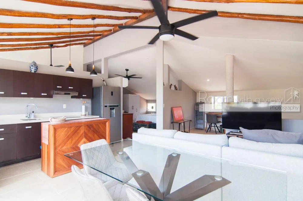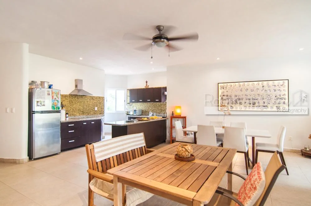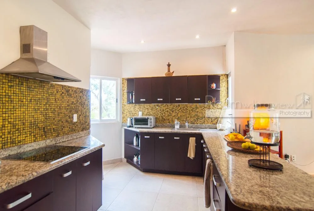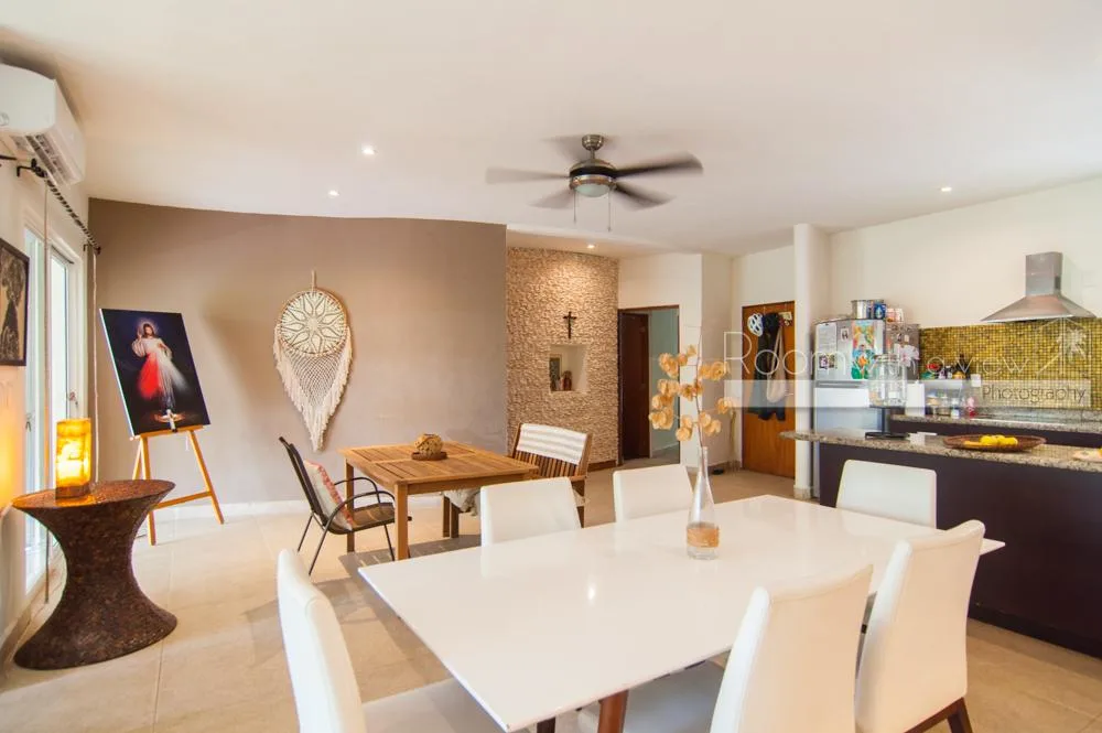 The home is a 3-minute walk from the marina and restaurants in Puerto Aventuras. It is 300 meters from the beach and 120 meters from the tennis courts. The property is divided into three self-contained units, one on each floor. The lower two floors each contain two bedrooms and two bathrooms. The top floor is a large studio penthouse with a private rooftop. Each floor features a full kitchen with an island, a walk-in closet, and a private balcony or terrace.