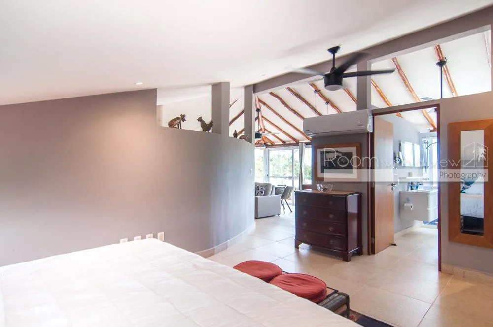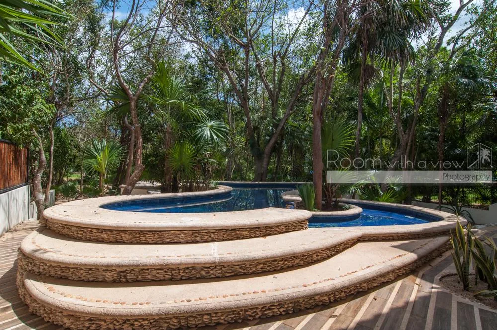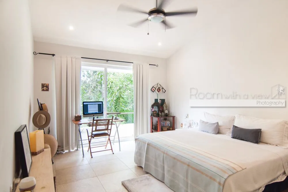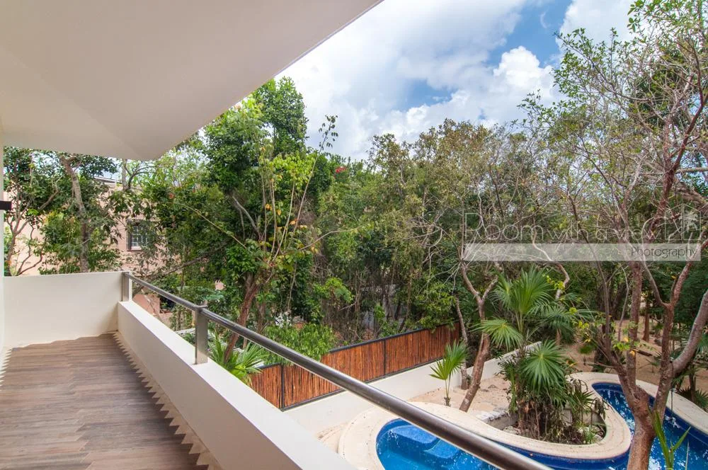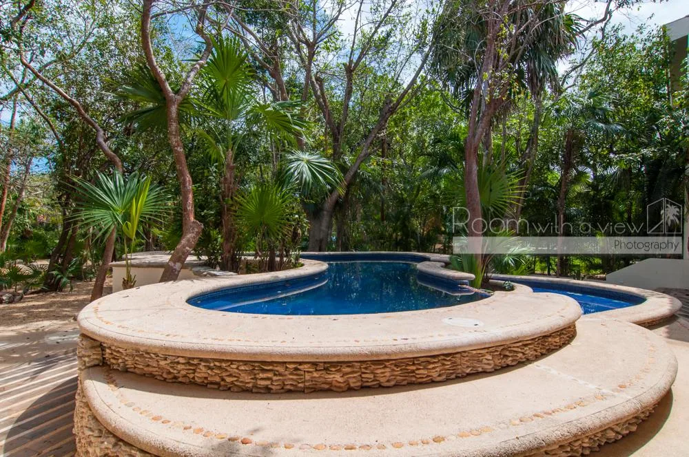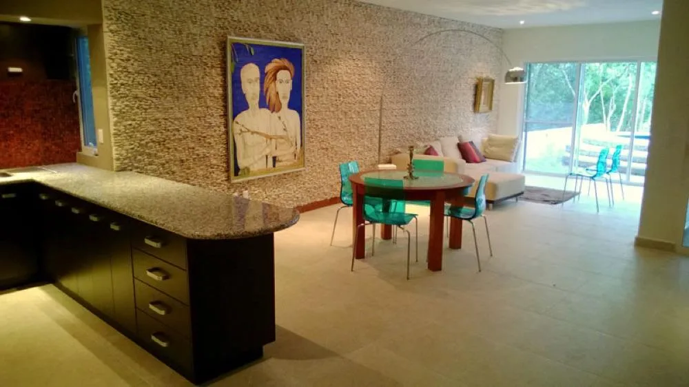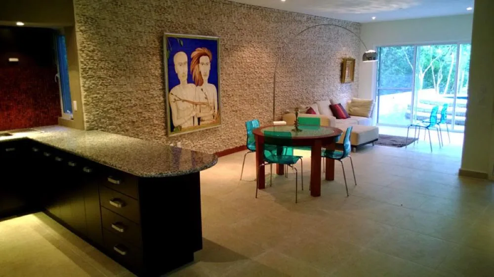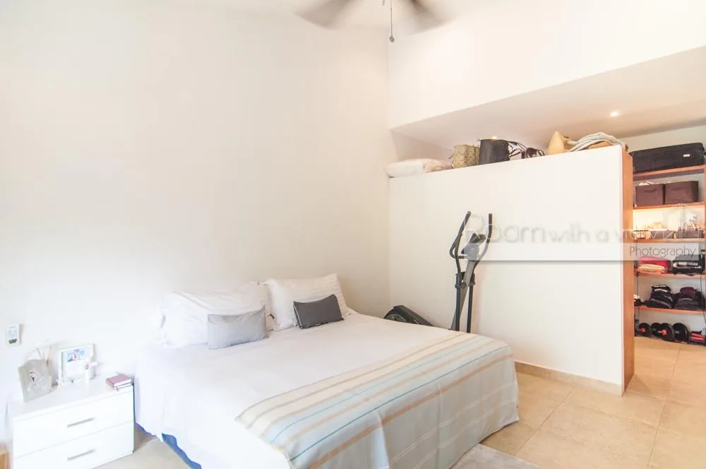 The home is a 3-minute walk from the marina and restaurants in Puerto Aventuras. It is 300 meters from the beach and 120 meters from the tennis courts. The property is divided into three self-contained units, one on each floor. The lower two floors each contain two bedrooms and two bathrooms. The top floor is a large studio penthouse with a private rooftop. Each floor features a full kitchen with an island, a walk-in closet, and a private balcony or terrace.