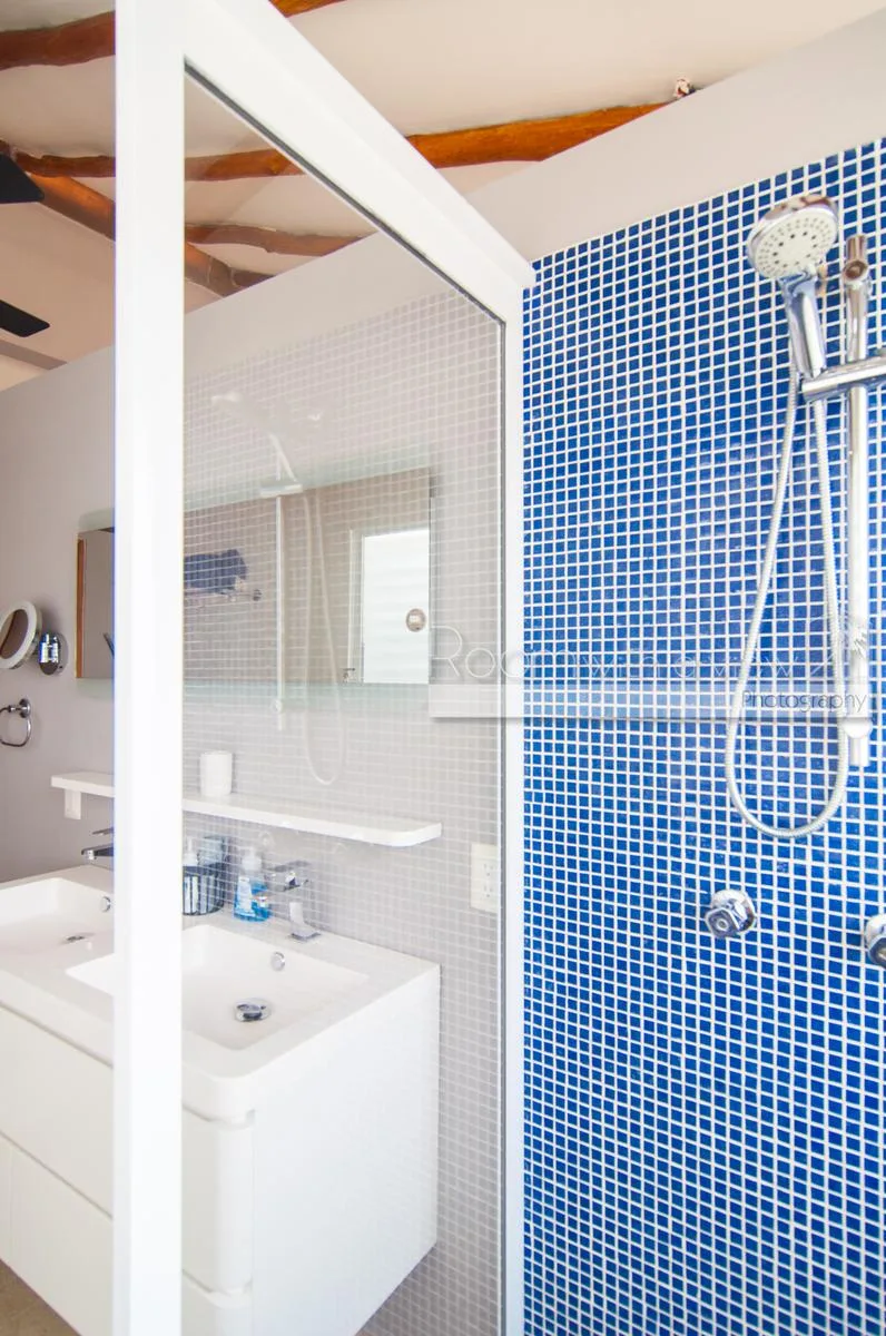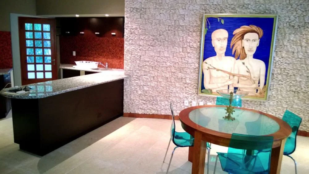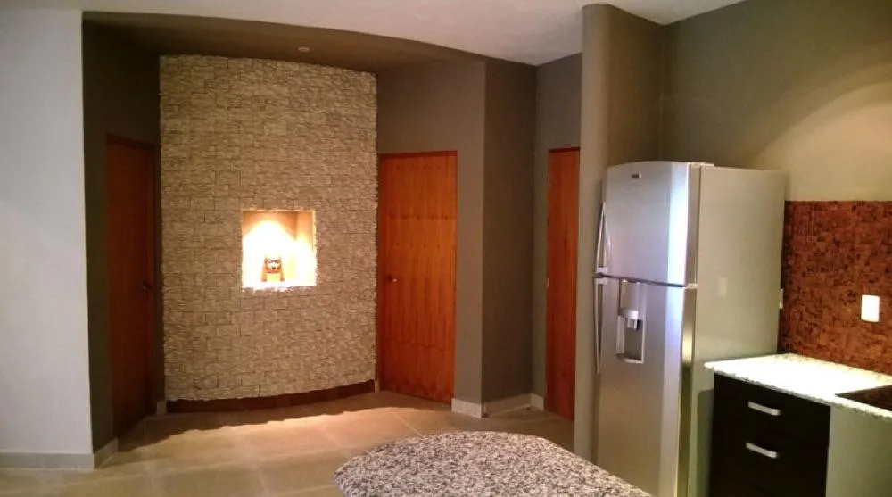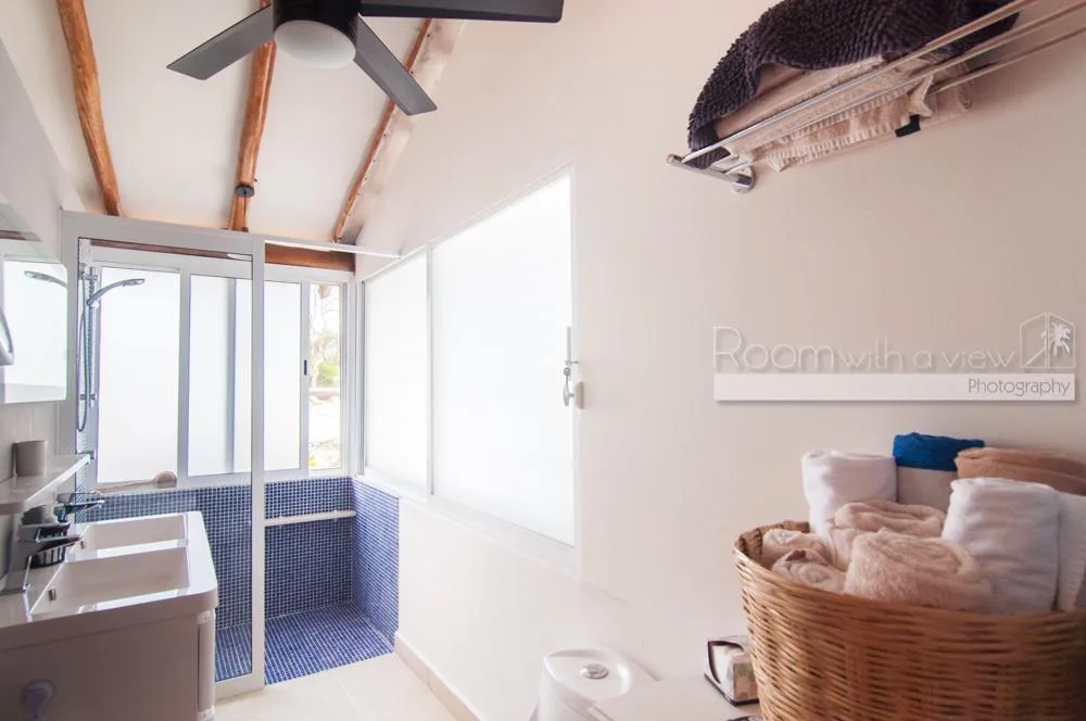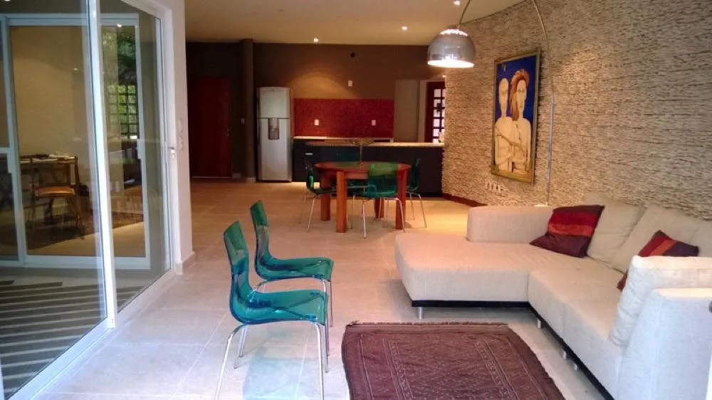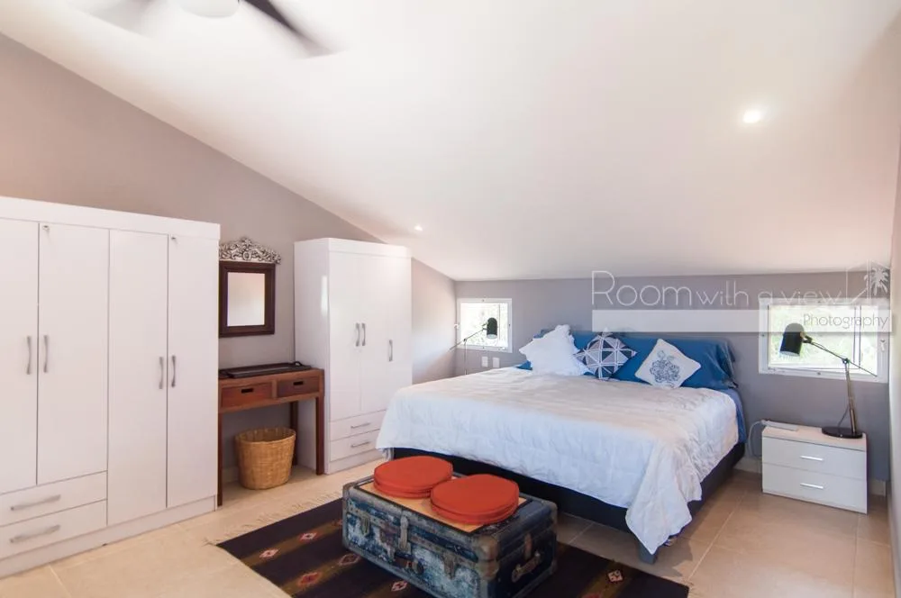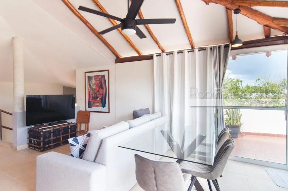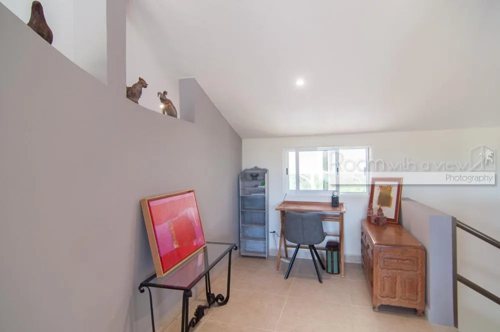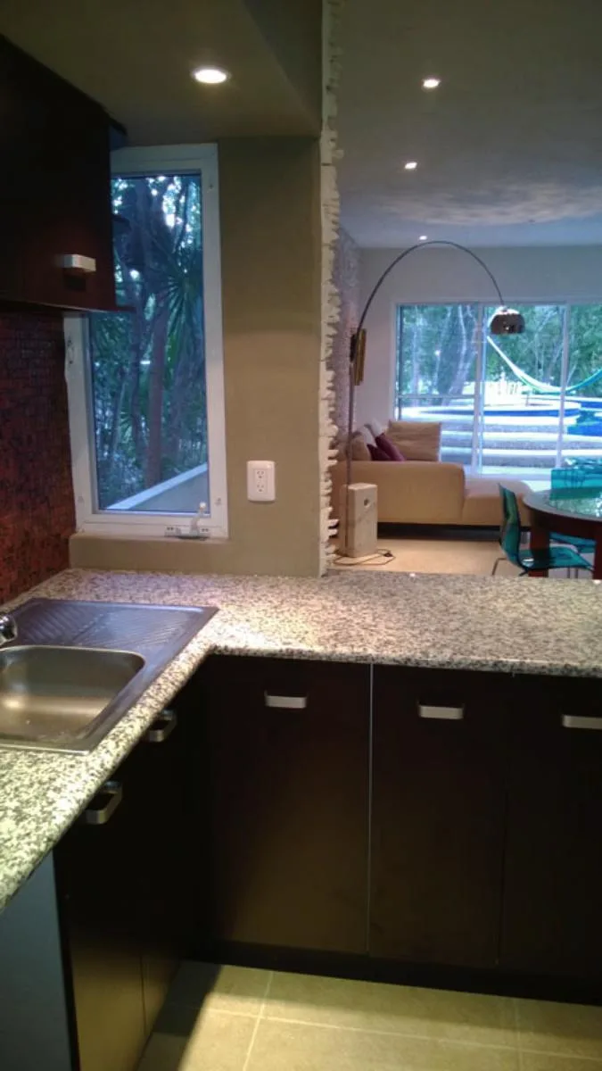The home is a 3-minute walk from the marina and restaurants in Puerto Aventuras. It is 300 meters from the beach and 120 meters from the tennis courts. The property is divided into three self-contained units, one on each floor. The lower two floors each contain two bedrooms and two bathrooms. The top floor is a large studio penthouse with a private rooftop. Each floor features a full kitchen with an island, a walk-in closet, and a private balcony or terrace.