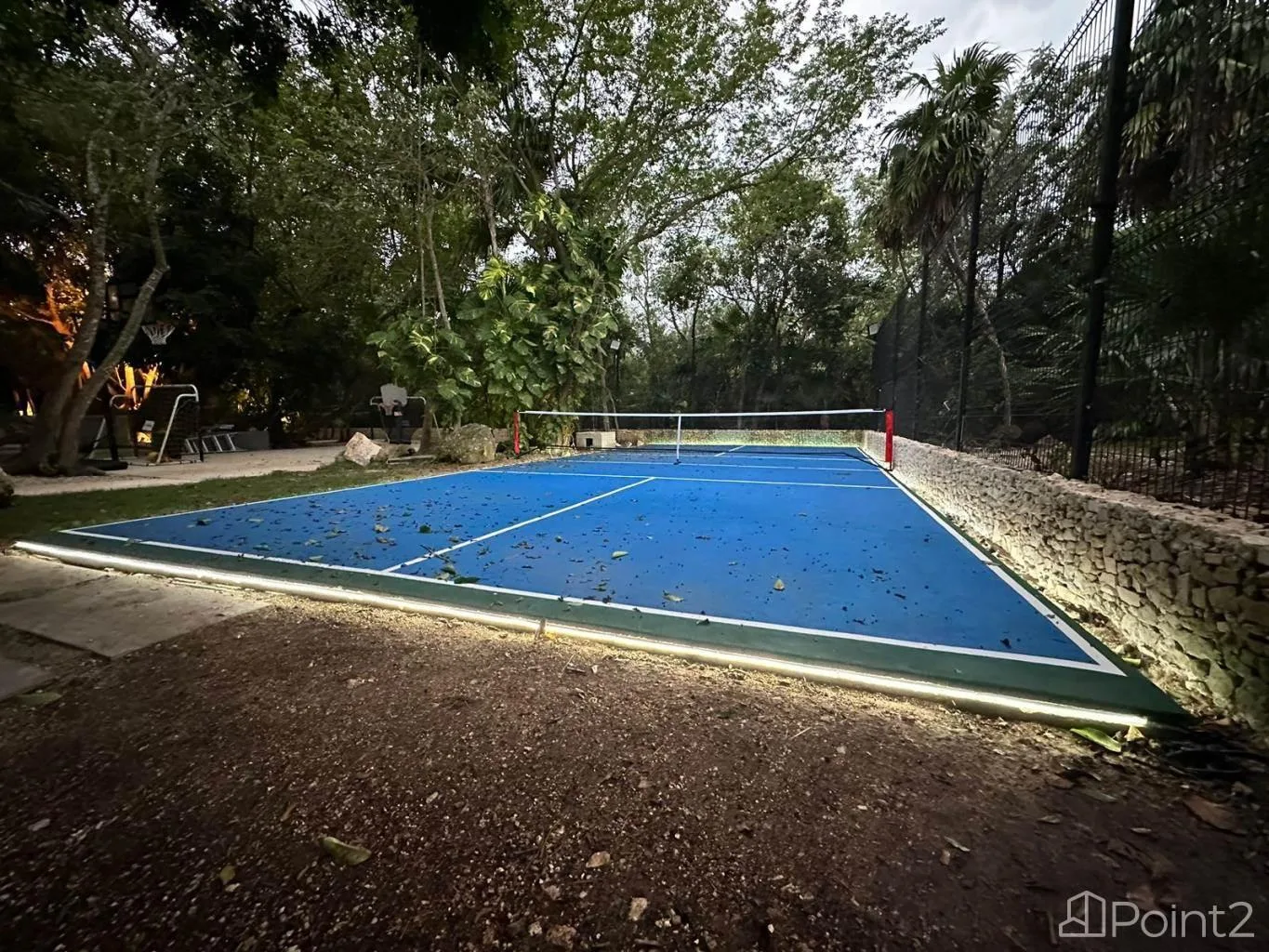 The exterior boasts a 25-meter by 5-meter swimming pool and a Pickleball court. The property offers views of the adjacent golf course, which runs 2250 linear meters along the estate. Additional amenities include a private gym and air-conditioned parking for six vehicles.
