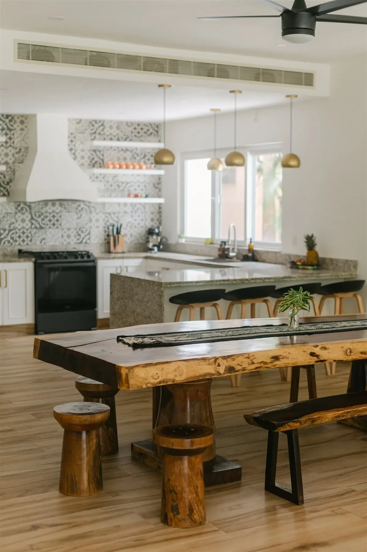The residence features five bedrooms, 2. 5 bathrooms, two living rooms, a studio, and an expansive open-plan dining room. The kitchen has been renovated and is fully equipped.