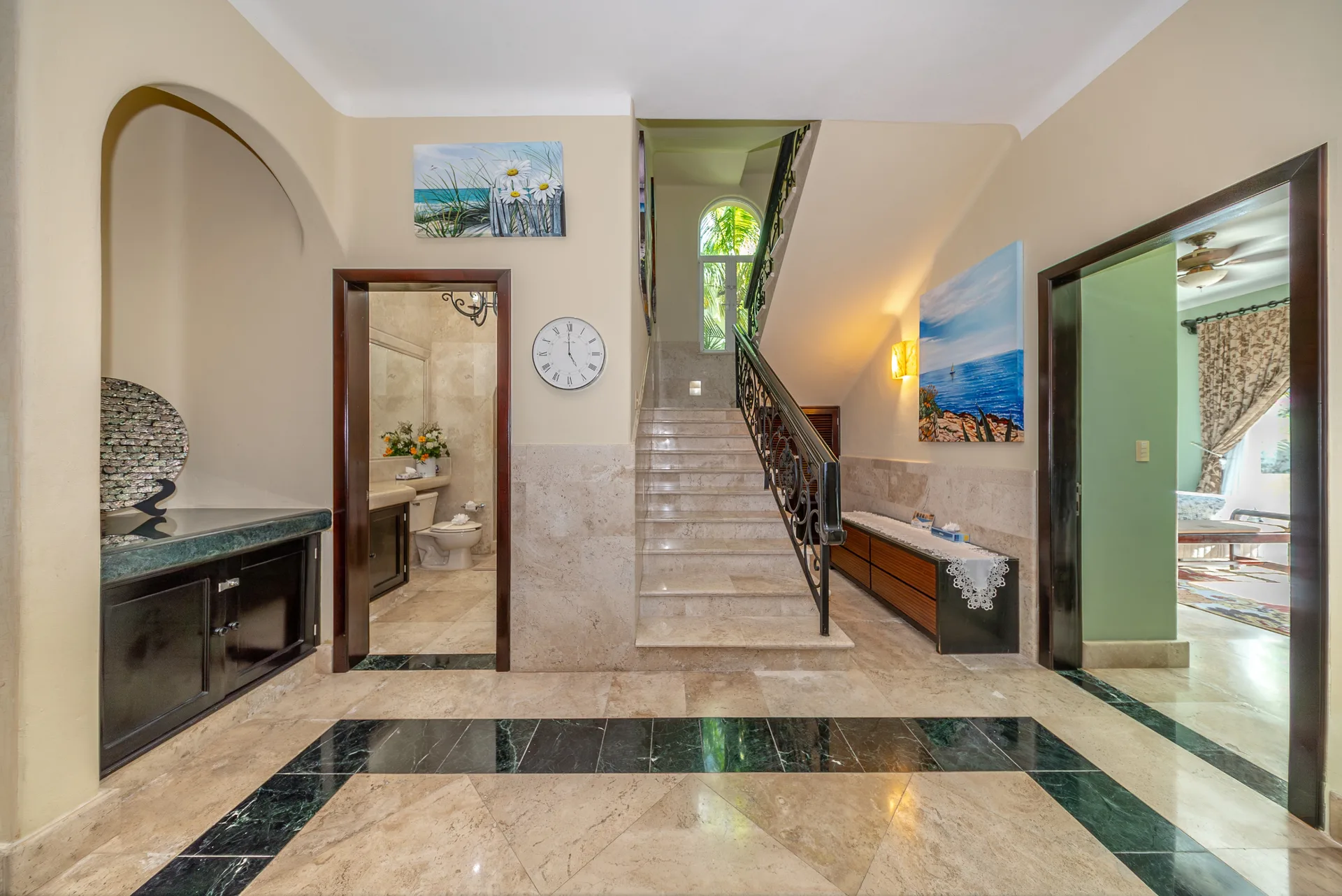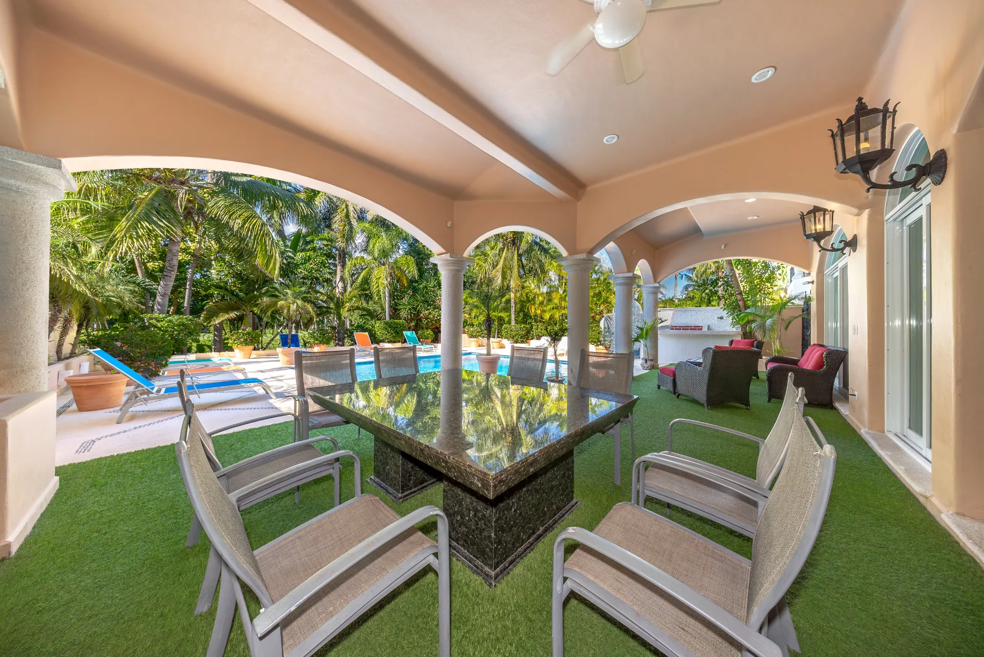 Arrival is marked by a refined entrance courtyard with a central fountain, framed by elegant architectural lines and lush greenery. The home showcases marble flooring throughout, graceful archways, and solid wood finishes. The living areas are bright and inviting, featuring custom built-in seating, high ceilings, and large openings that connect seamlessly to the outdoor terraces and pool area.