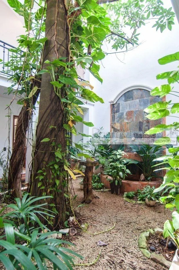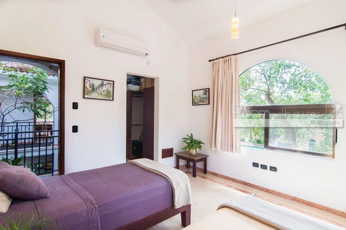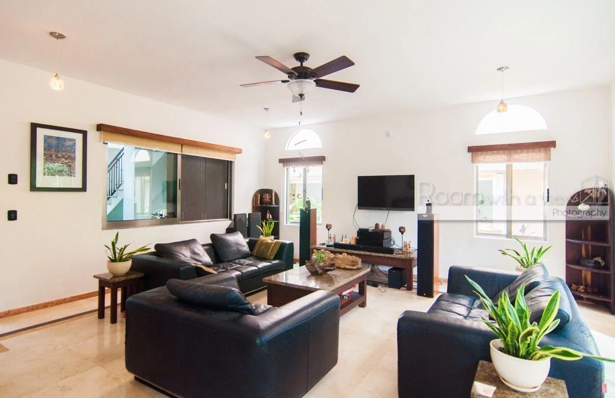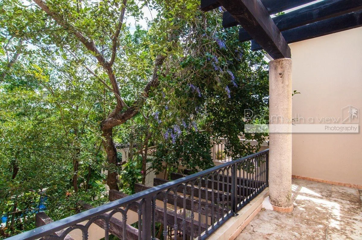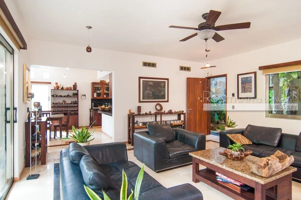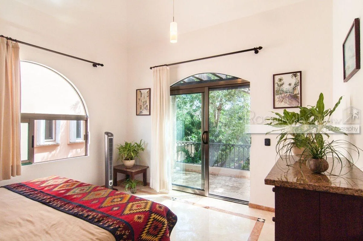 This expansive 6-bedroom home features ample natural light and an open-air atrium with a large tree and a fountain. The main floor includes a bright living room, a dining area, and a full kitchen with a breakfast bar and premium appliances. Finishes consist of high-quality natural materials such as Tzalam wood, marble, granite, and Cantera stone. The upstairs bedrooms open onto private balconies with sweeping views. The home is equipped with solar panels, a dedicated water purification and softening system, ceiling fans, air conditioning, hurricane shutters, and an alarm system.