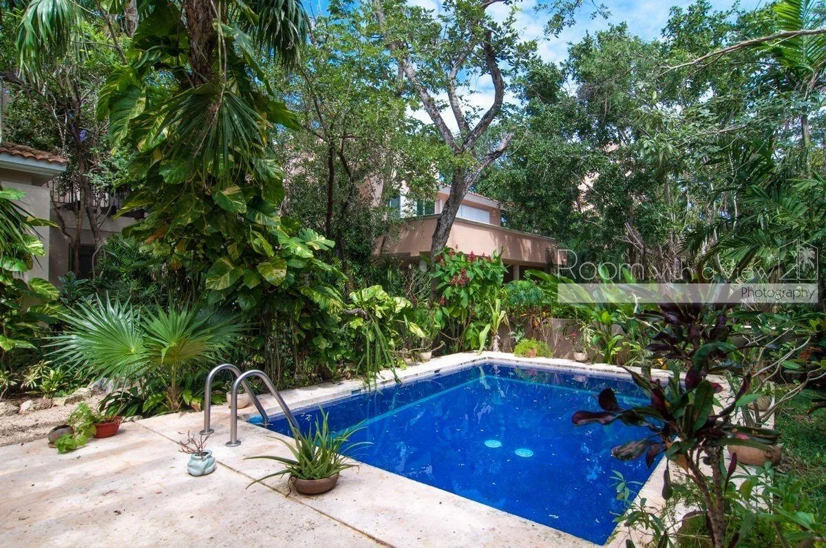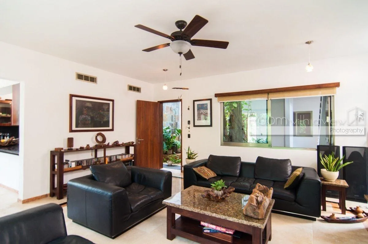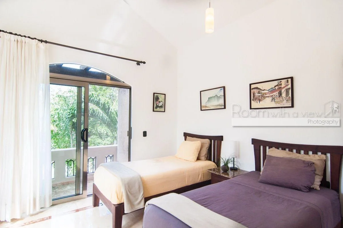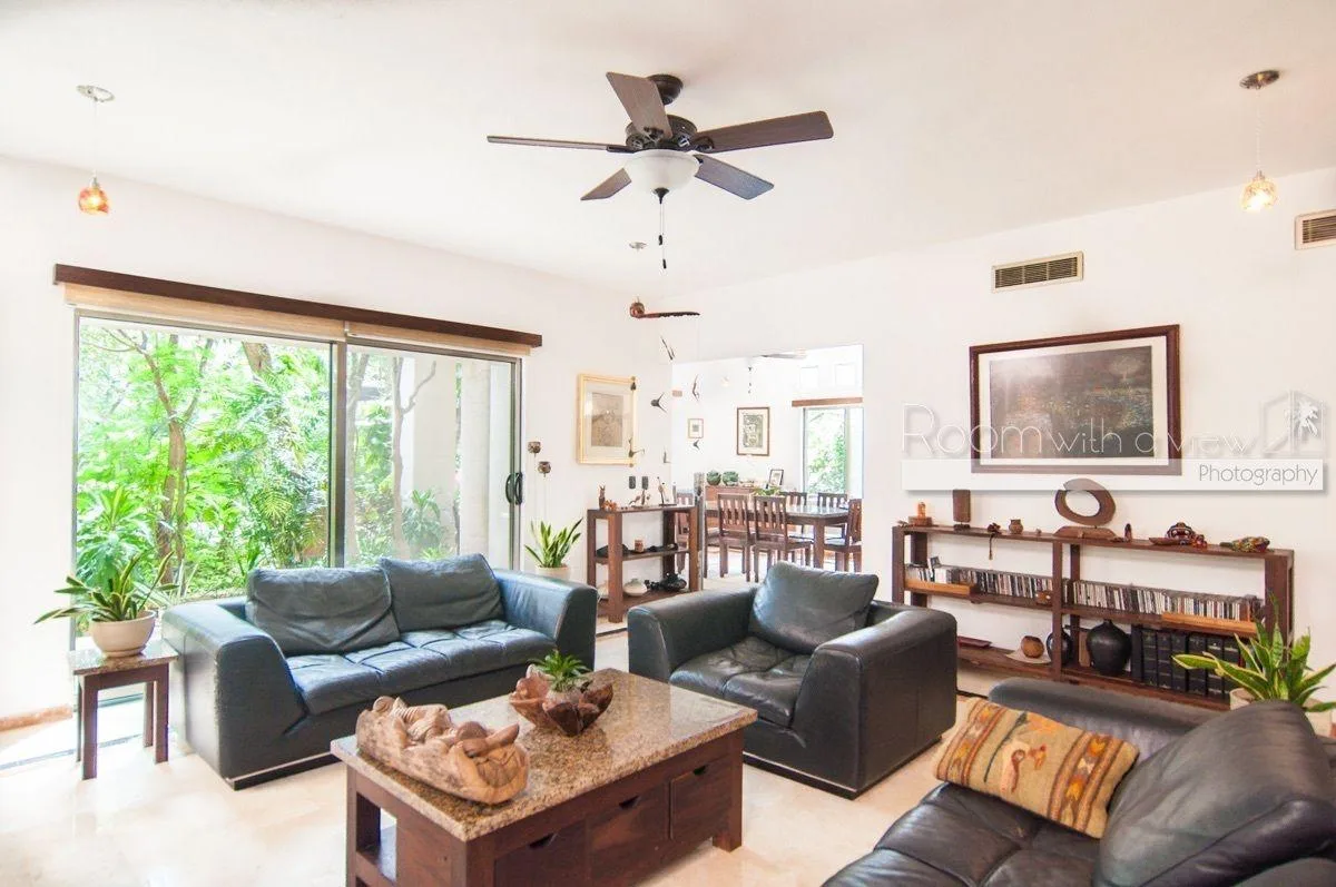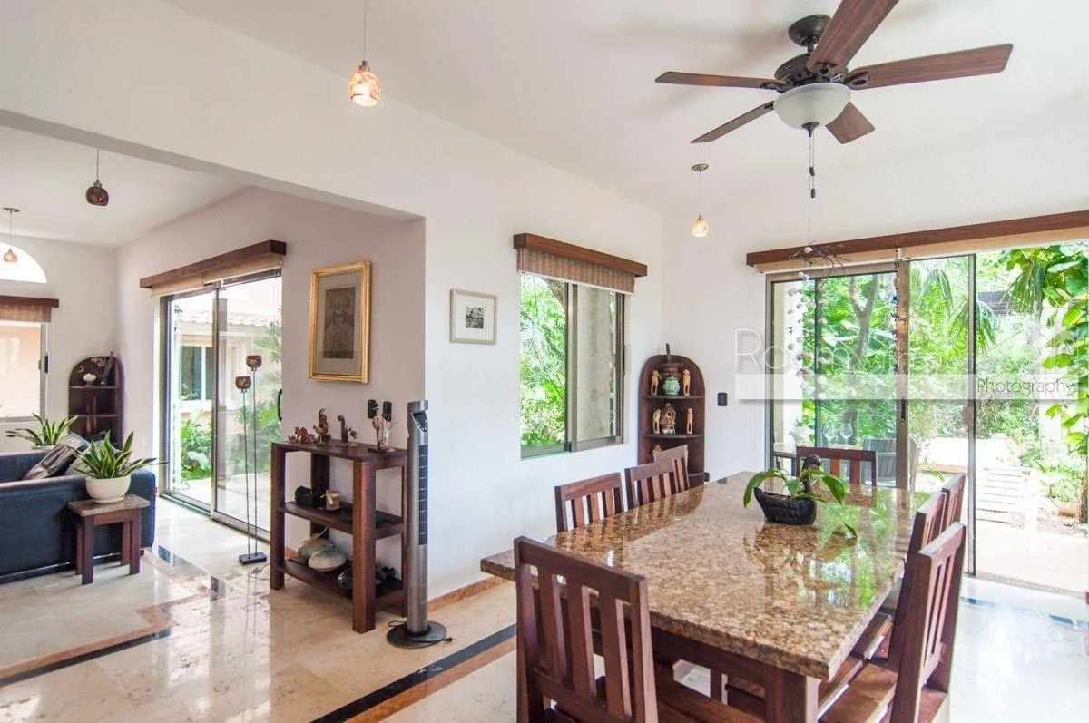 This expansive 6-bedroom home features ample natural light and an open-air atrium with a large tree and a fountain. The main floor includes a bright living room, a dining area, and a full kitchen with a breakfast bar and premium appliances. Finishes consist of high-quality natural materials such as Tzalam wood, marble, granite, and Cantera stone. The upstairs bedrooms open onto private balconies with sweeping views. The home is equipped with solar panels, a dedicated water purification and softening system, ceiling fans, air conditioning, hurricane shutters, and an alarm system.