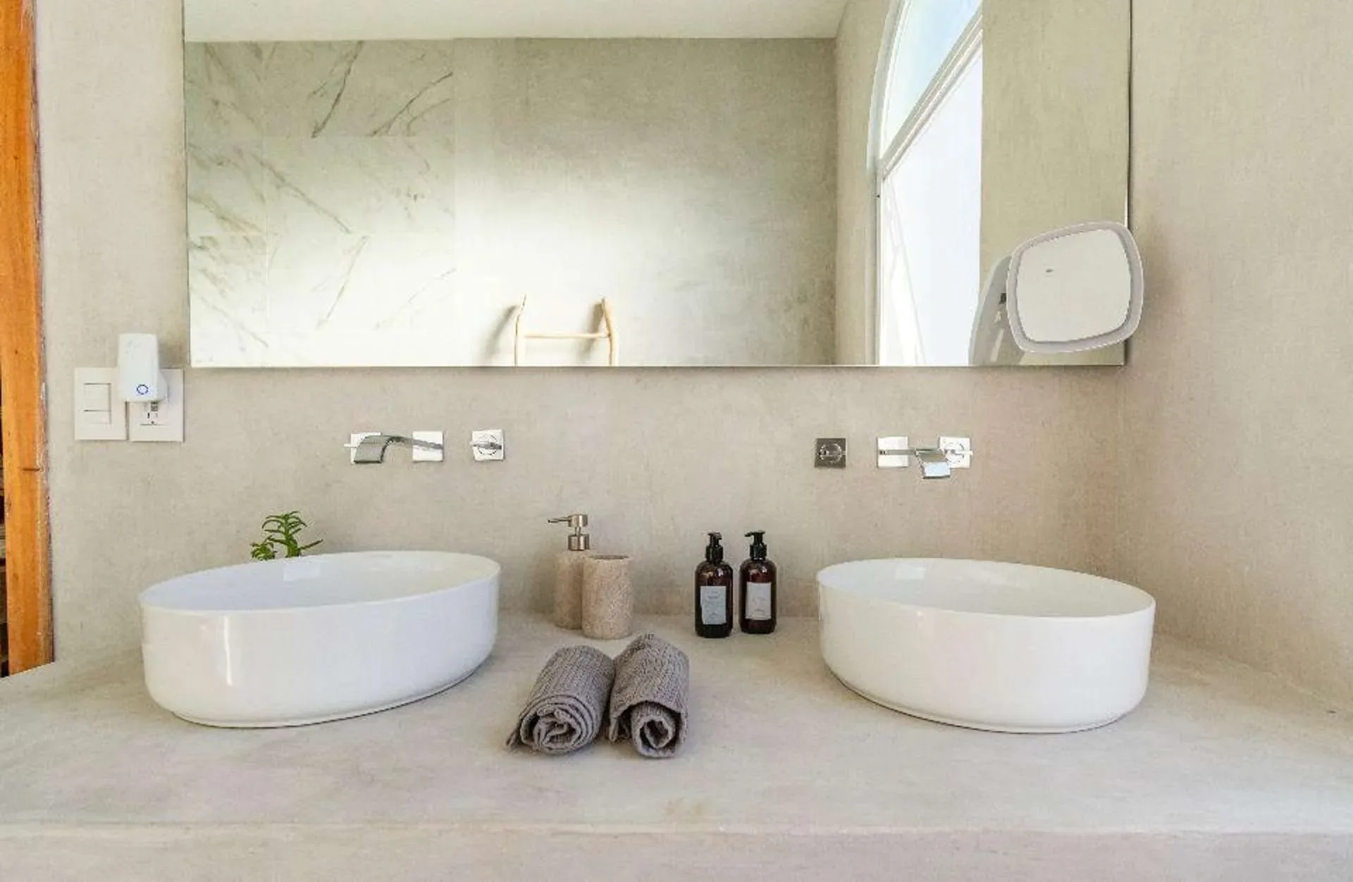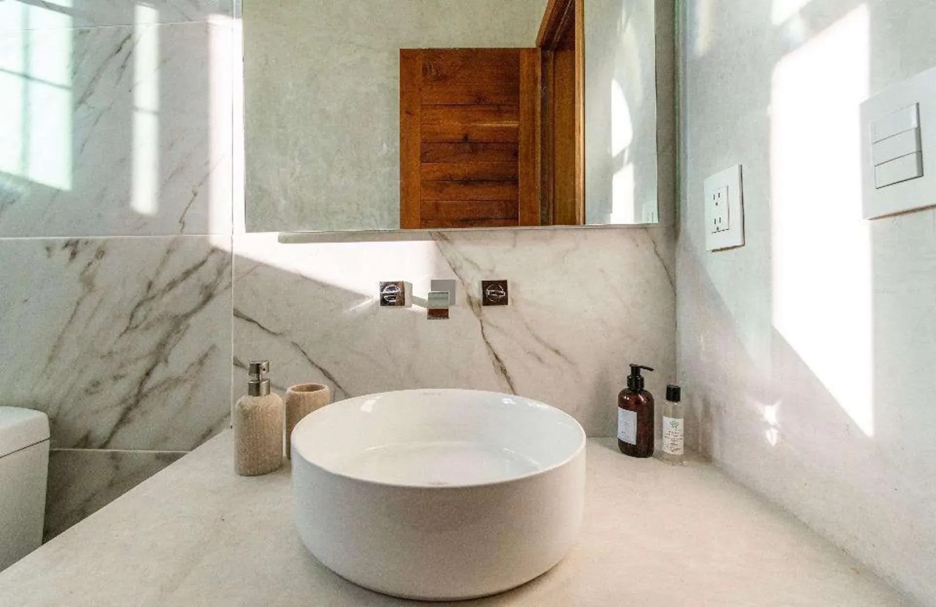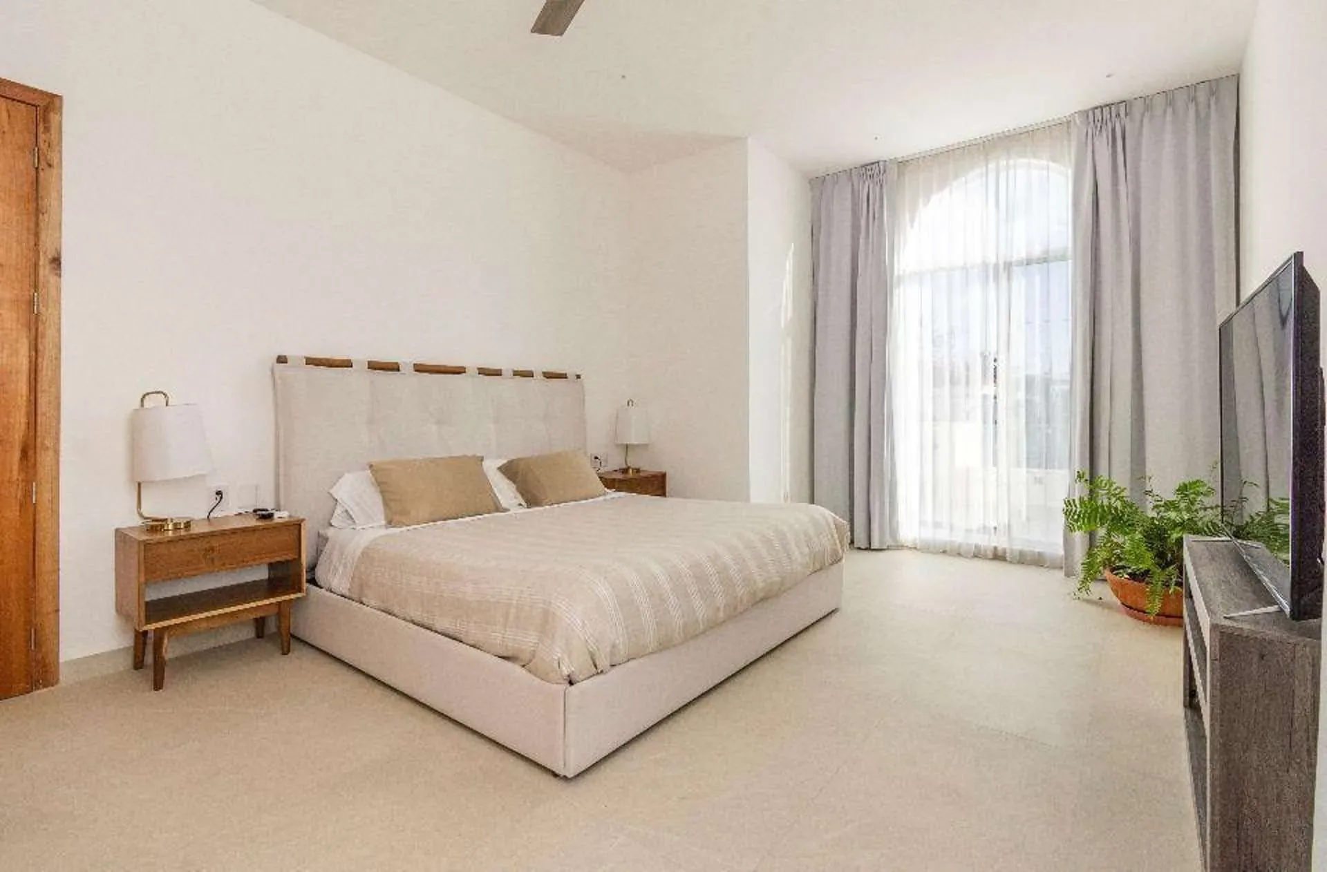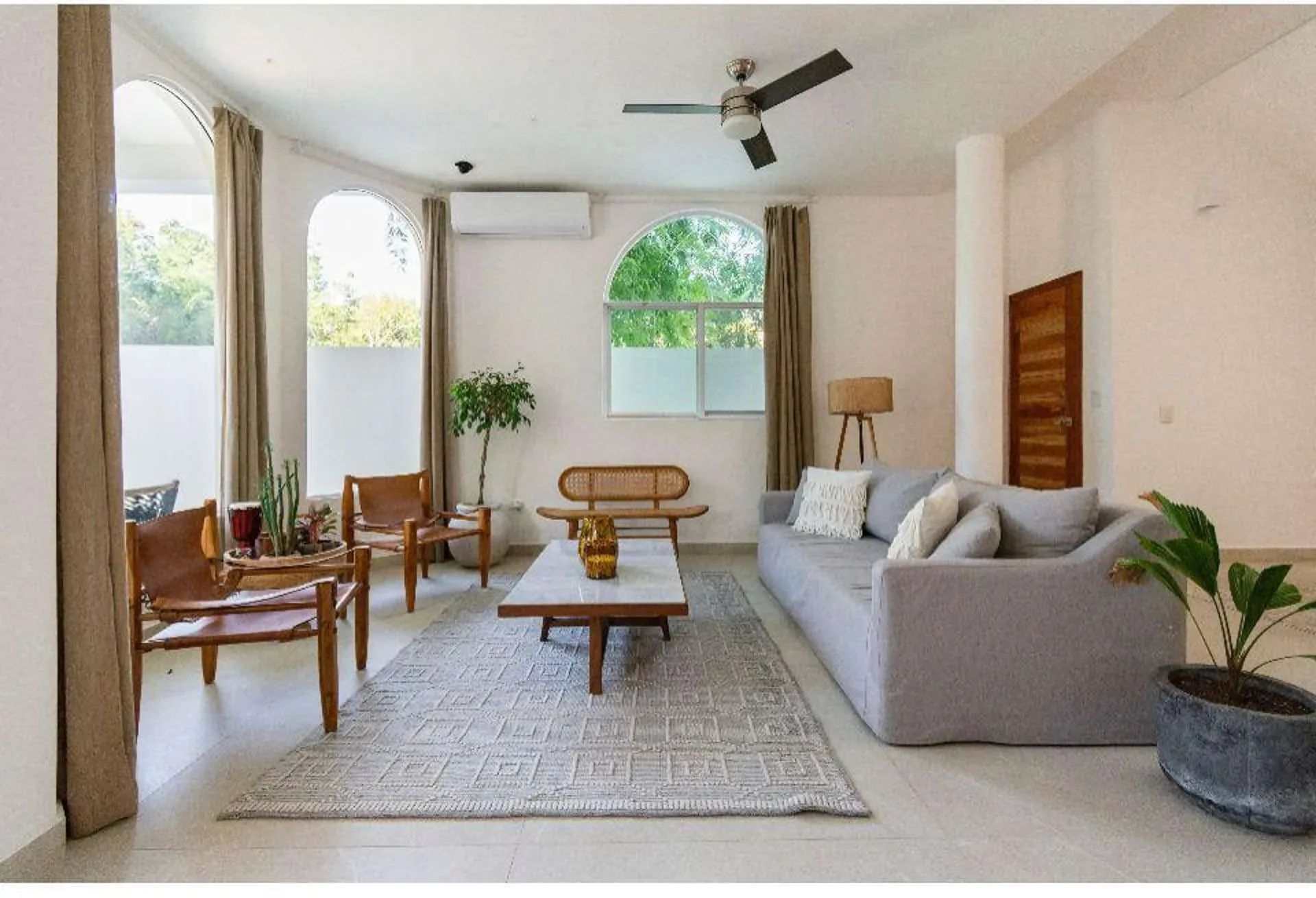 The property features four bedrooms and five bathrooms in the main house, accompanied by a separate one-bedroom guest house. The contemporary interiors are finished with marble and light woods, and the residence comes fully furnished with high-end appliances.