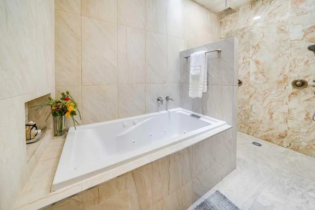 The property offers five bedrooms, including two master suites with king beds and three bedrooms with double beds. There are five full bathrooms and one half bath, all equipped with luxury finishes and rain showers.