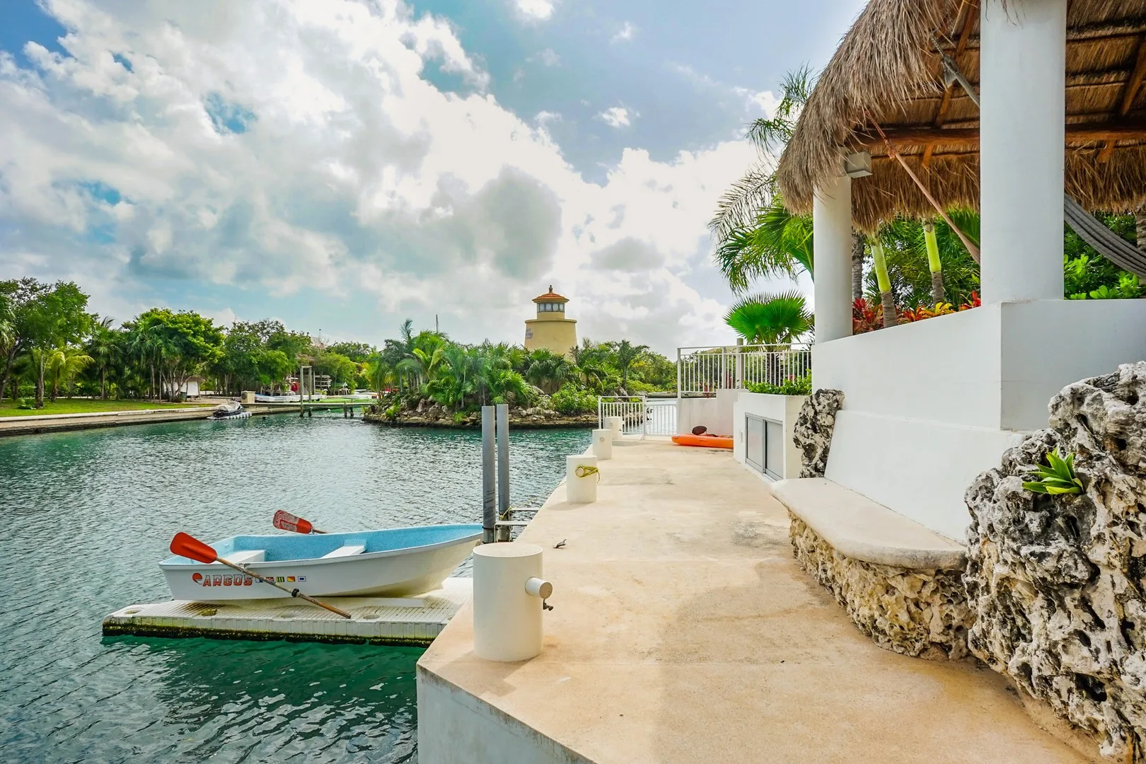 This spacious canal-front residence is located within the private marina of Puerto Aventuras on the Riviera Maya. It is situated in the residential area known as Phase 4, offering direct marina access.