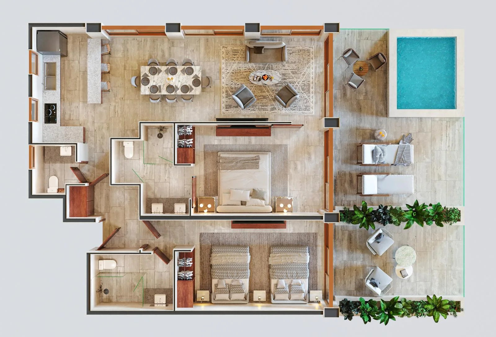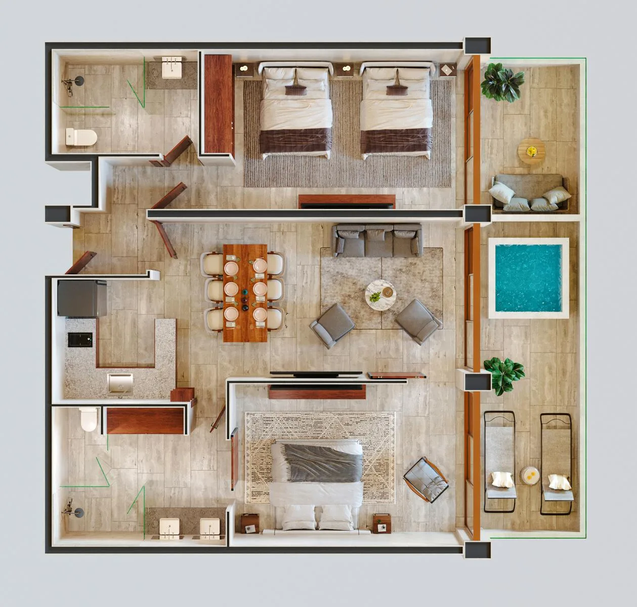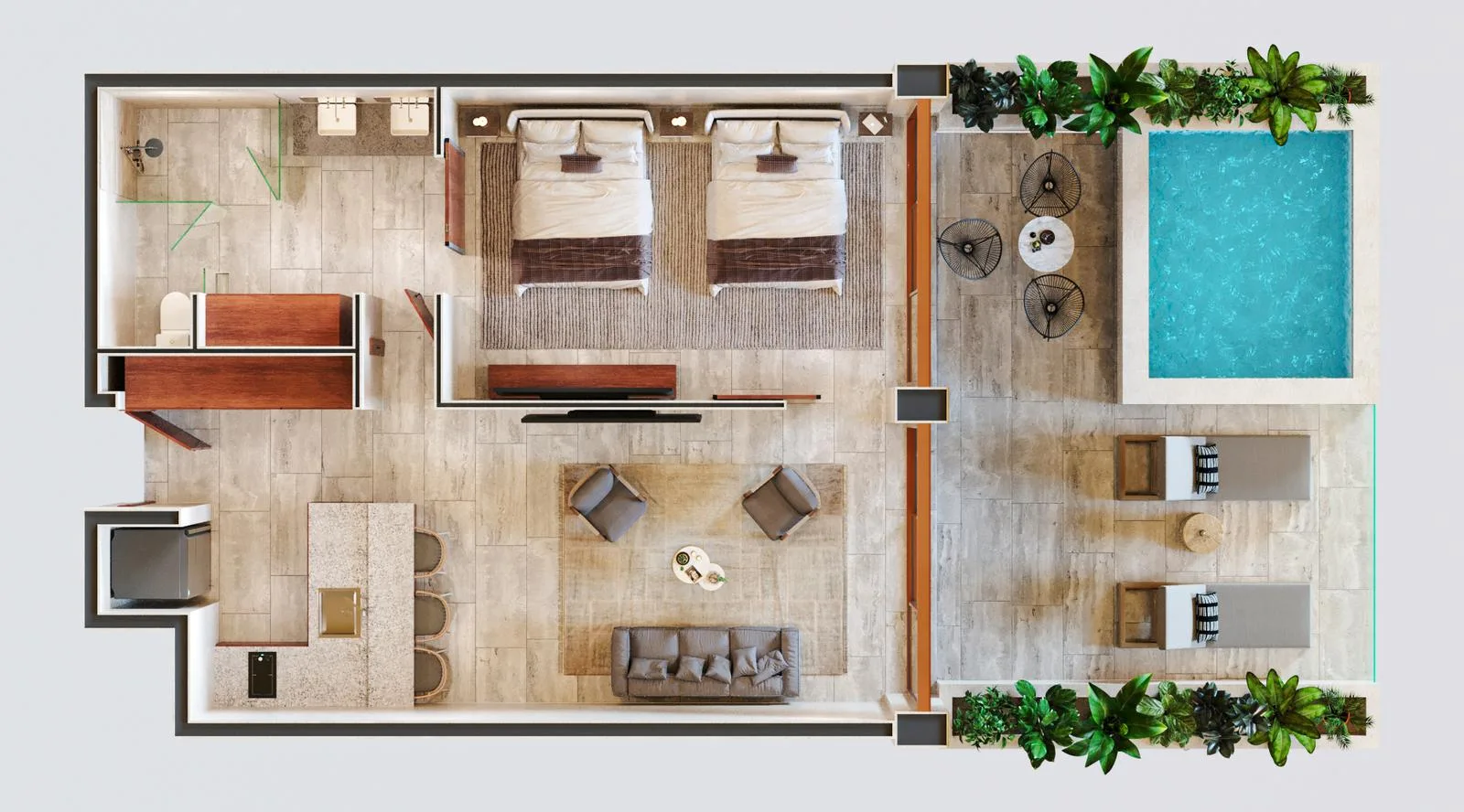 There are 73 fully furnished and equipped oceanfront condos. The design emphasizes detail and sensory appeal.