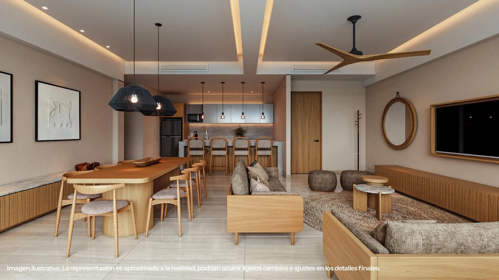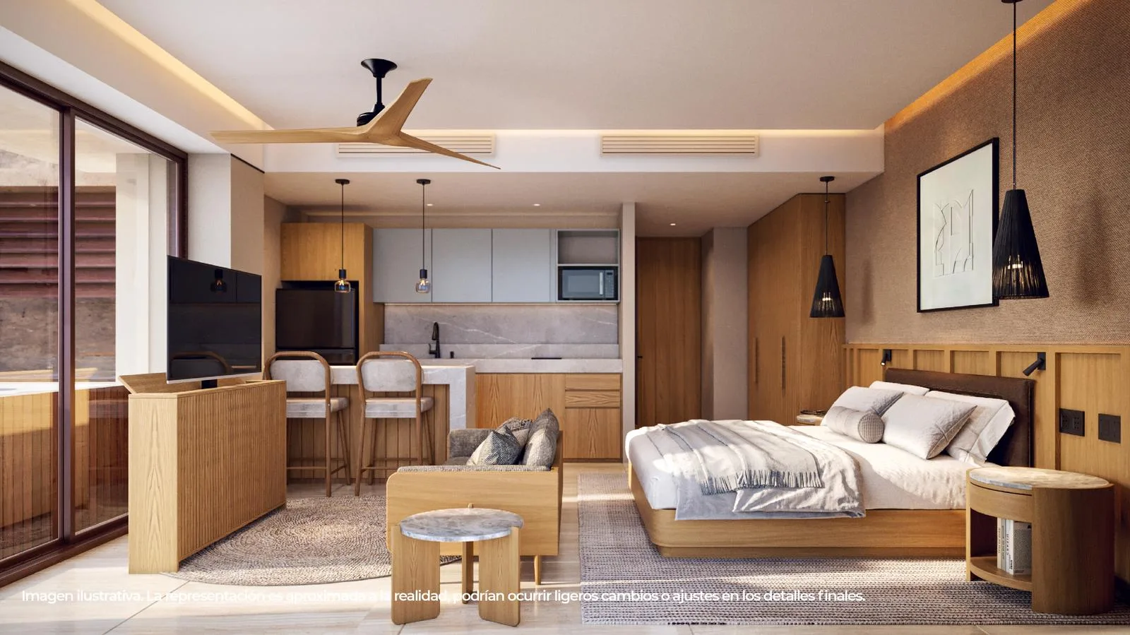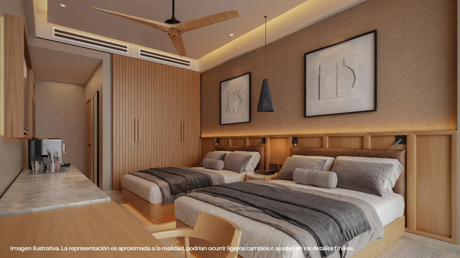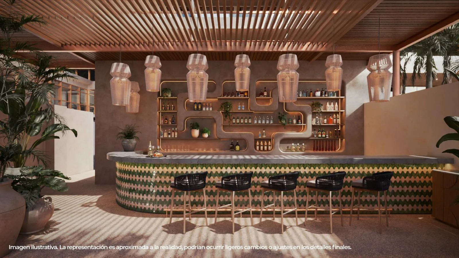 The building offers an infinity pool facing the sea, a rooftop sky bar with panoramic views, a restaurant, a snack bar, and a lobby bar. Amenities include a spa with a temazcal and jacuzzi, a gym, and yoga areas. Residents have private access to a beach club. Available services include a spa concierge, room service, and housekeeping. The property provides 24/7 security, concierge services, and condotel management.
