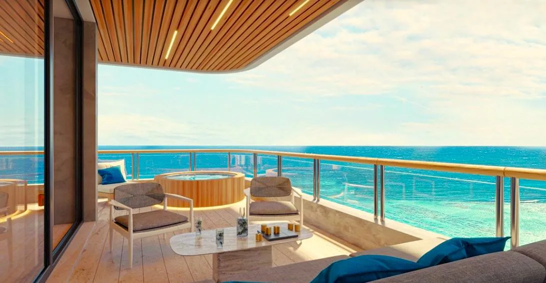 The building features a range of first-class amenities. These include an infinity pool with panoramic sea views, a sky bar and rooftop terrace, beach and pool cabanas for relaxation, and a fire pit with a swimming lane. There is a paddle tennis court and a fully equipped gym, a games room and co-working space, and a restaurant with in-room service.