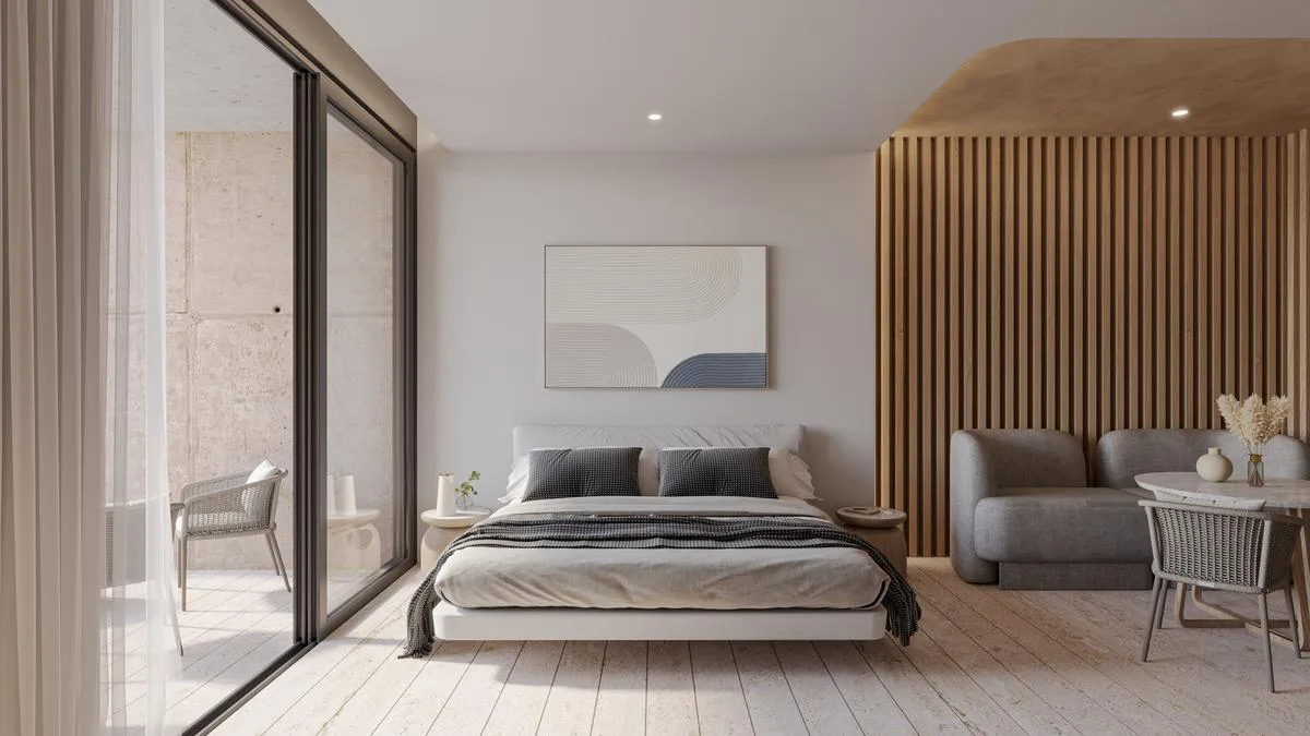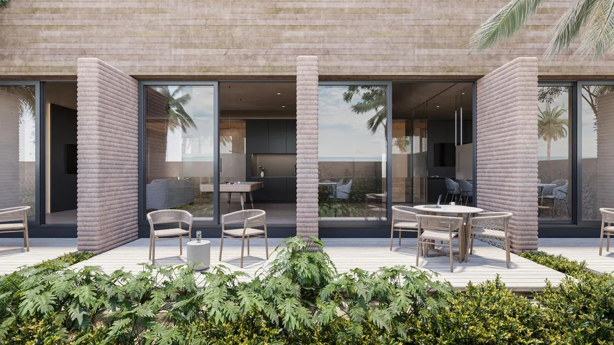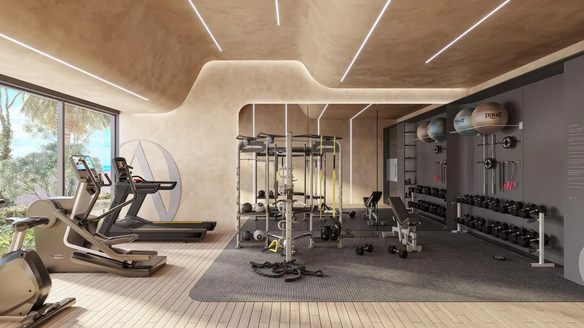 Amenities at the development encompass a private beach club with sunbeds and palapas, an infinity pool facing the sea, and a gym with a swimming lane. Additional facilities include a paddle tennis court, a sky terrace and sky bar with a jacuzzi, a restaurant and room service, and a wellness area with a sauna and spa. There is also a coworking space, a game room, a fire pit and lounge, and a lobby with concierge and valet parking. Internal transportation and electric bicycles are provided, along with kayaks and paddle boards, and 24/7 security.