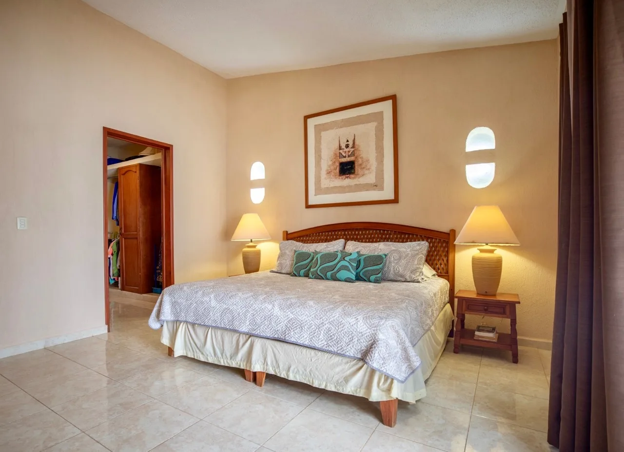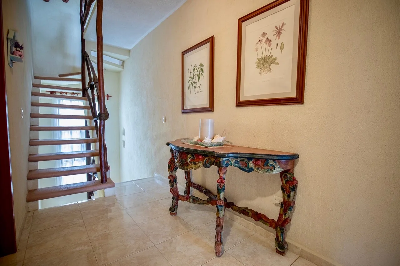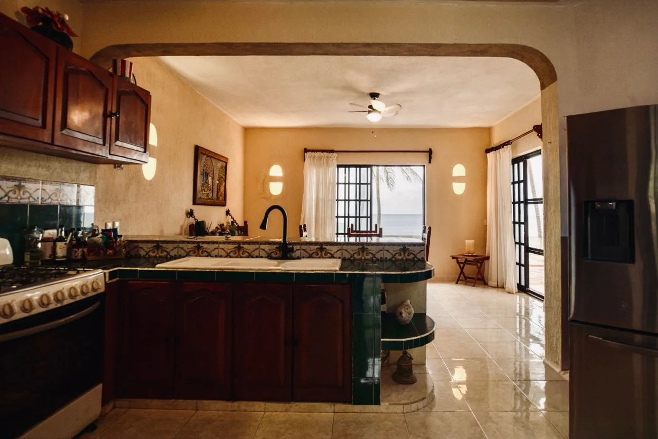 This beachfront villa in Puerto Morelos is located just steps from the turquoise waters of the Caribbean. The residence is spread over two levels and features three well-sized bedrooms and three full bathrooms.