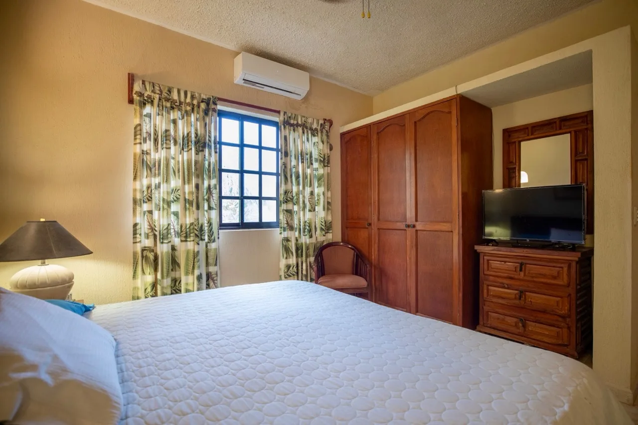 The main living area opens to the ocean, welcoming natural light and sea breezes. The master bedroom includes a private balcony with open water views. Interior finishes include warm wood, and the home is equipped with modern essentials like air conditioning.