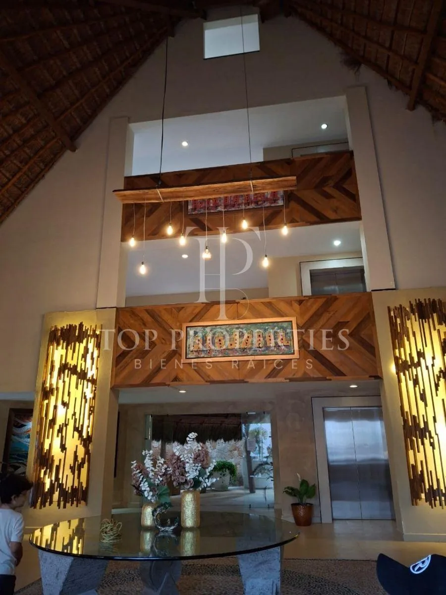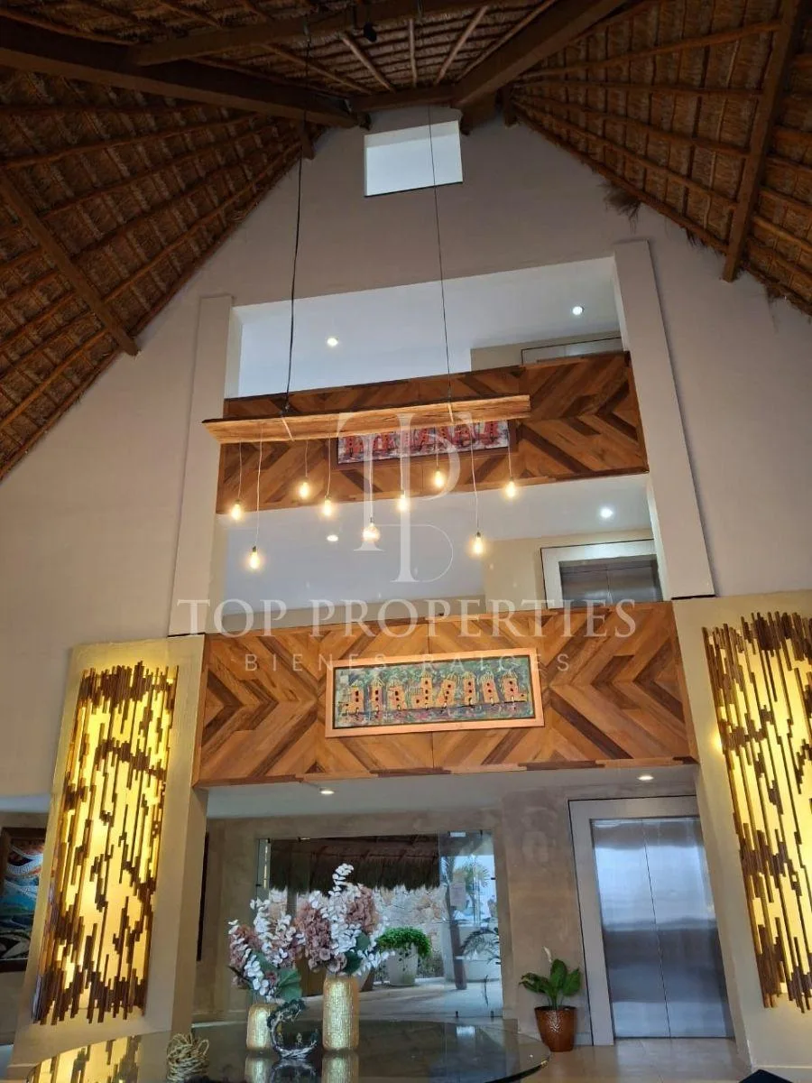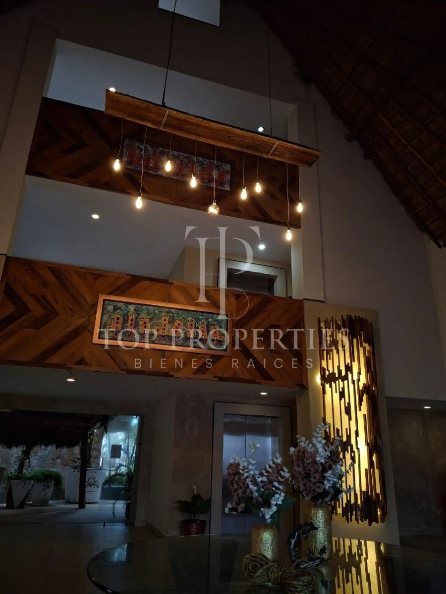 The condominium is situated in Bahia Petempich and offers communal amenities including a swimming pool, security, a lobby, a gym, and an elevator. It provides direct access to the sea. The location is approximately 7 minutes from the tourist zone of Puerto Morelos, 15 minutes from Cancun International Airport, 30 minutes from downtown Cancun, 10 minutes from a large outlet mall, 15 minutes from the Puerto Morelos Maya Train station, and 30 minutes from Playa del Carmen.