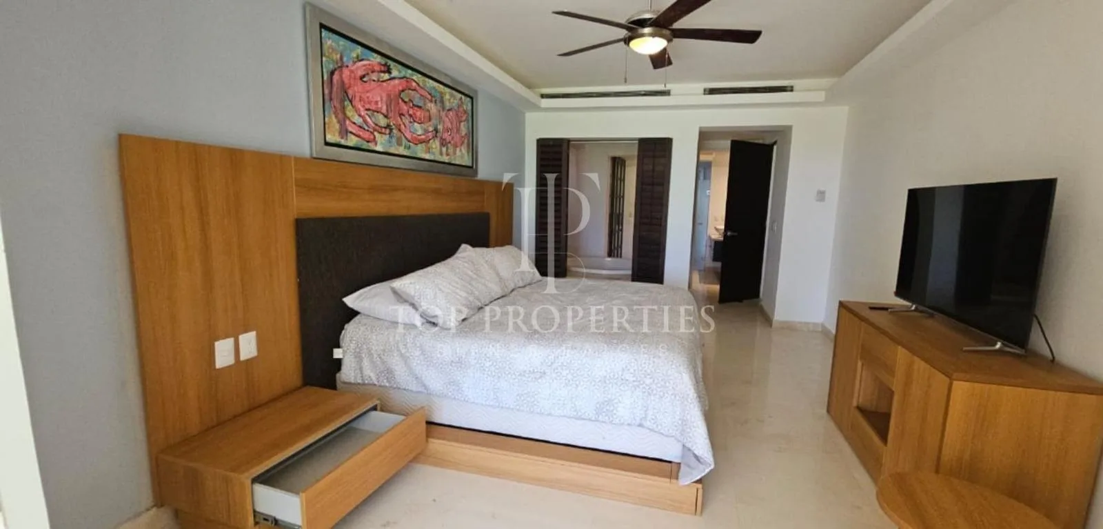 The primary bedroom includes a king-size bed with a wooden base, a closet, a 32-inch smart TV, a jacuzzi, and a full bathroom. A second bedroom contains two full-size beds with wooden bases and a closet. It shares a full bathroom with a third bedroom, which has a full-size bed, a closet, and a credenza.