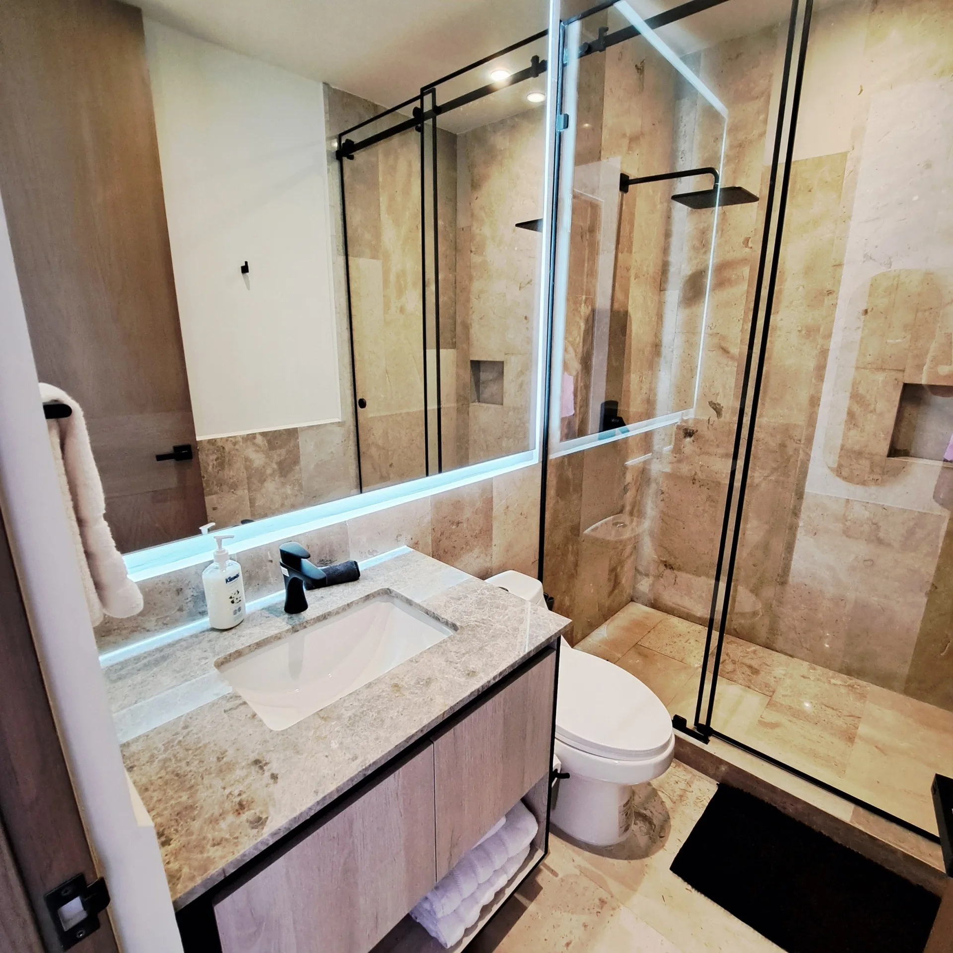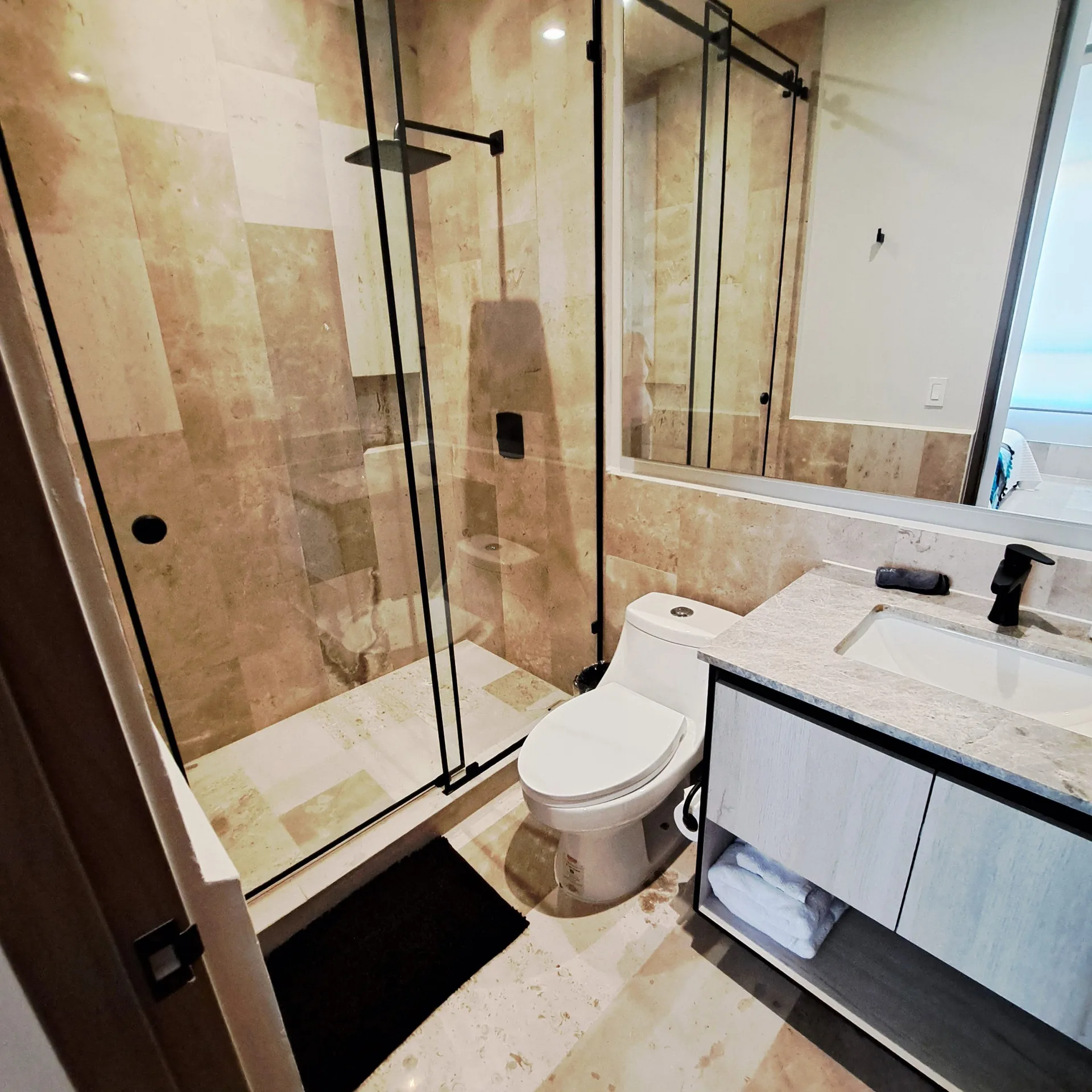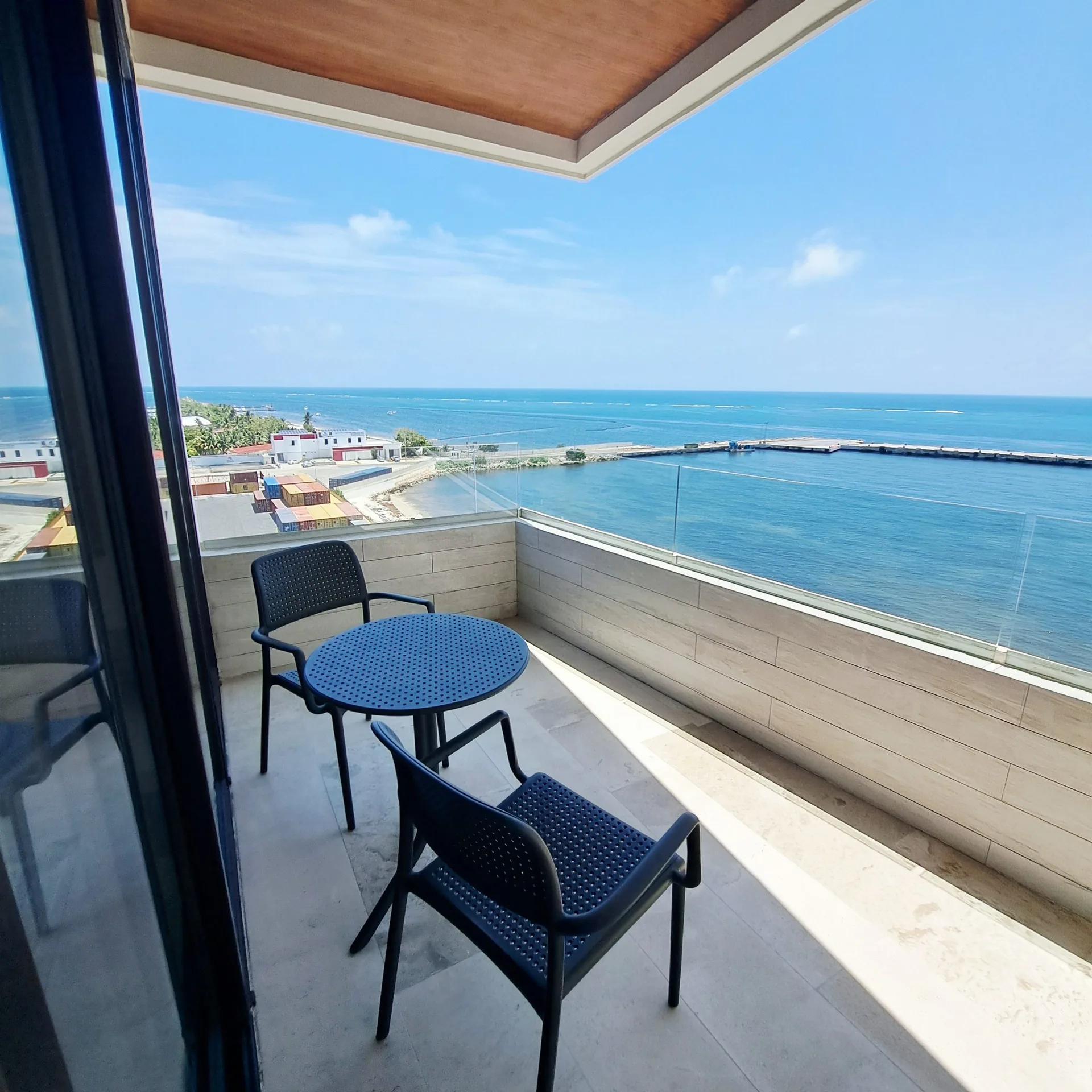 The residence is equipped with two bedrooms and two full bathrooms. It features a walk-in closet, a fully equipped kitchen, a bright social area, and a private terrace where the turquoise sea becomes the central focus. The unit is delivered fully furnished and ready to occupy.