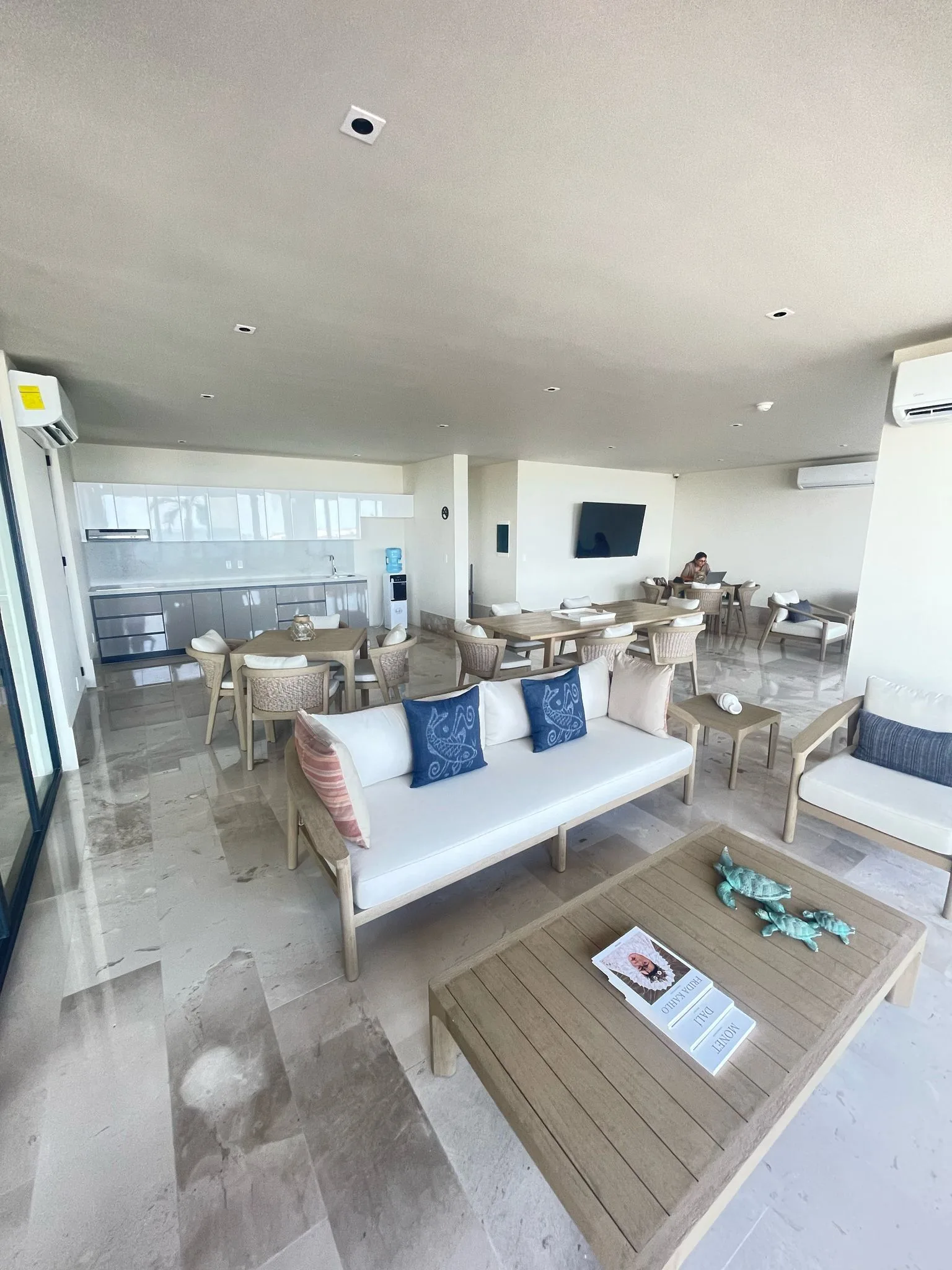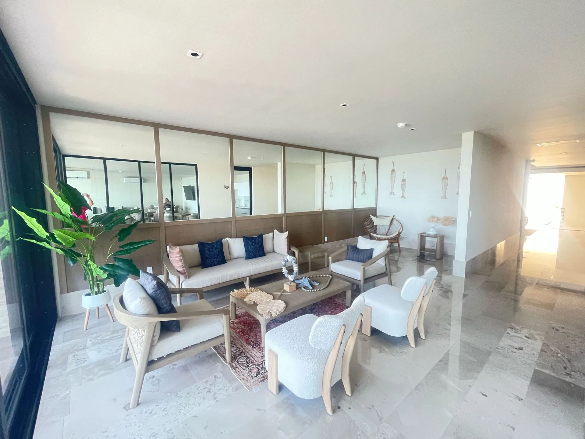 The architecture combines contemporary lines with natural materials, reinforcing the connection between interior and exterior. Floor-to-ceiling windows frame the ocean and allow the sea breeze and sound of the waves to become part of daily life.