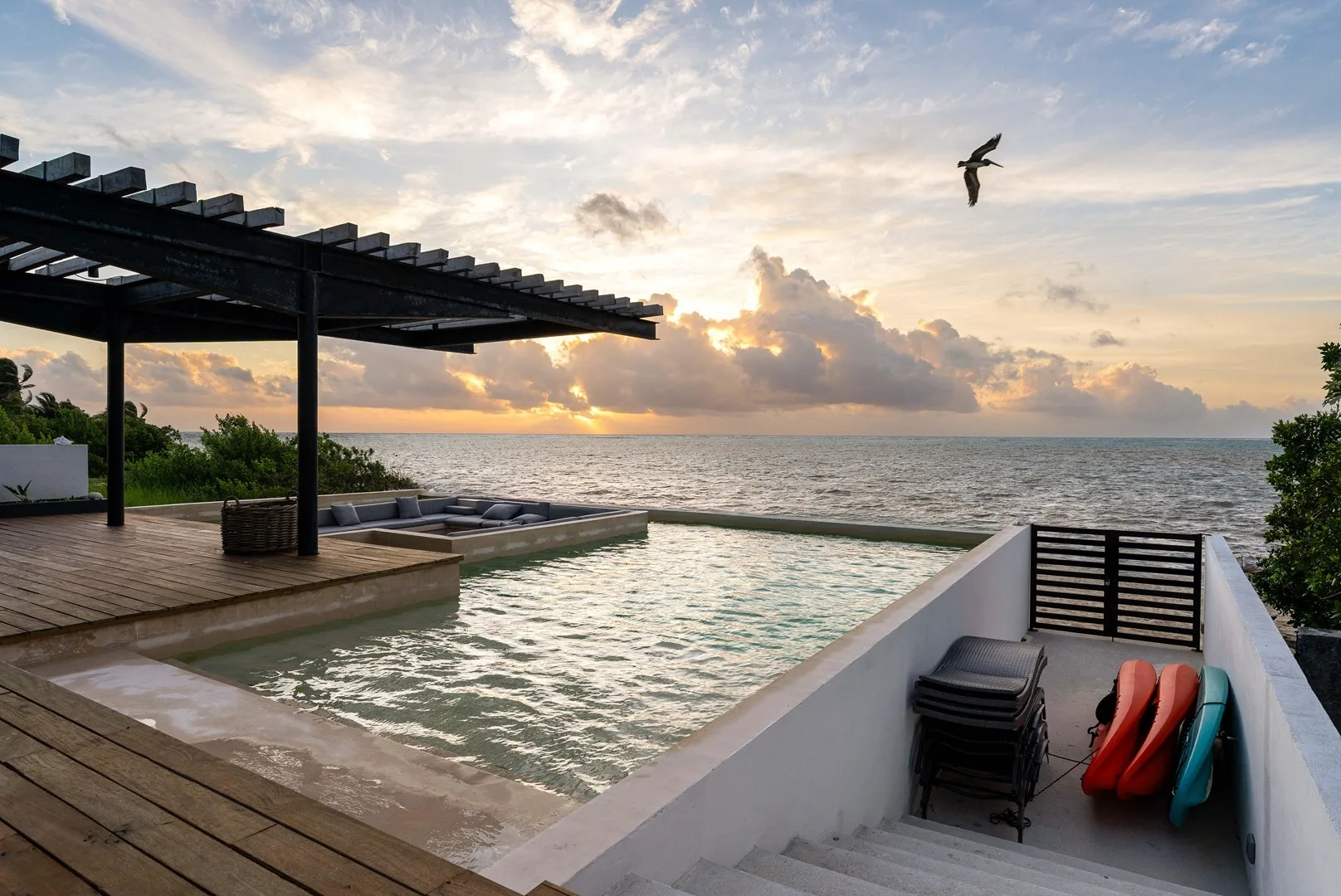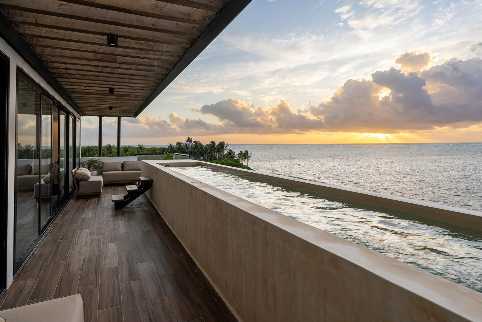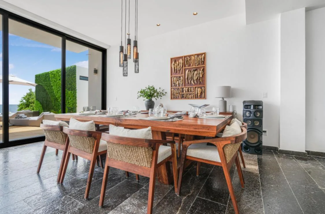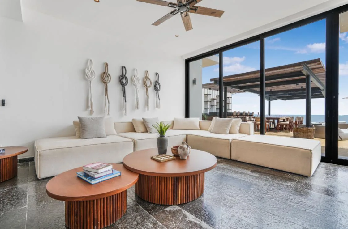 This property is a beachfront sanctuary located along the pristine shores of Puerto Morelos. The home offers panoramic ocean views and a lifestyle in harmony with its tropical surroundings.