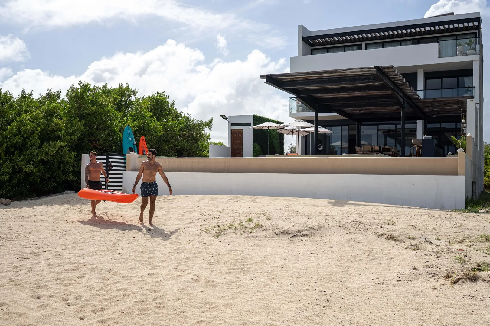 The estate features over 1, 100 square meters of living space on a private 820 square meter beachfront lot. Walls of glass blur the line between indoors and outdoors, inviting the ocean breeze into expansive living areas.