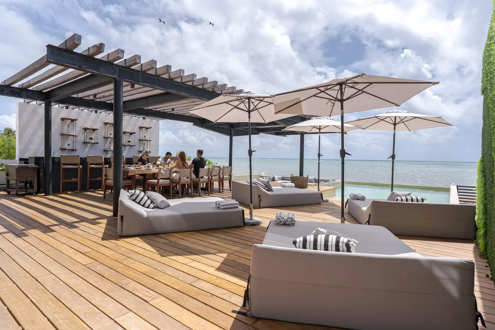 An infinity pool and sun deck provide views of the horizon, and a private cocktail bar is available for entertainment.