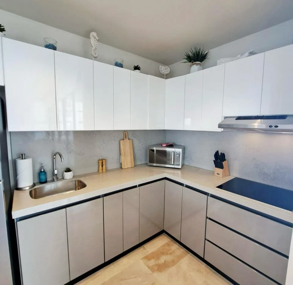 Situated on the fourth floor, the unit offers a spacious open-concept living and dining area, flooded with natural light. Its floor-to-ceiling windows frame panoramic and uninterrupted ocean views, creating the ideal atmosphere to wake up to the sound of the waves and enjoy unforgettable sunsets from the comfort of your home.