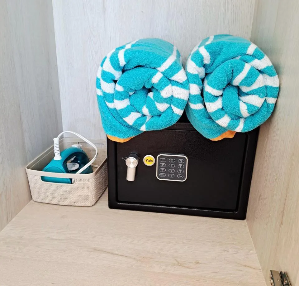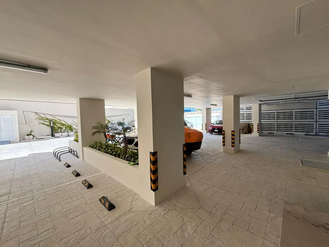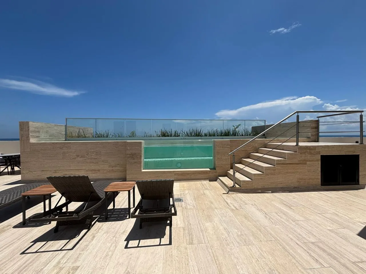The property offers resort-style amenities. There is direct access to a spectacular white-sand beach and a swimming pool facing the sea. A rooftop area features a pool and lounge spaces. Other amenities include a barbecue and entertainment area, a fully equipped gym, a multi-purpose room, and an elevator.