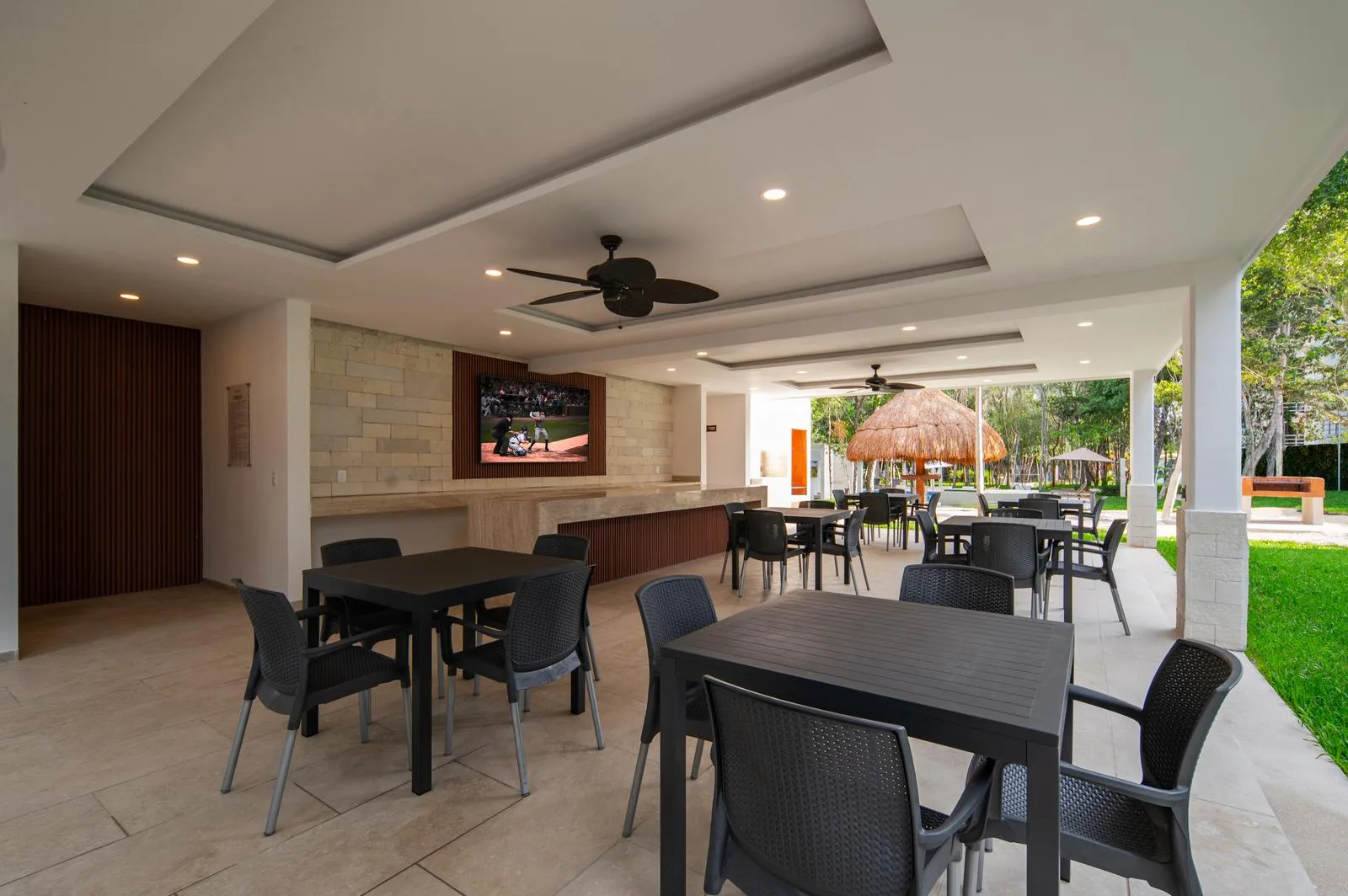The property provides access to numerous amenities such as an adult pool, a children's pool, a clubhouse, a pool bar, tennis courts, multi-use courts, pickleball courts, a coworking space, an equipped gym, a yoga area, children's playgrounds, palapas and hammock areas, a pet area, green spaces, and a security booth with controlled access.
