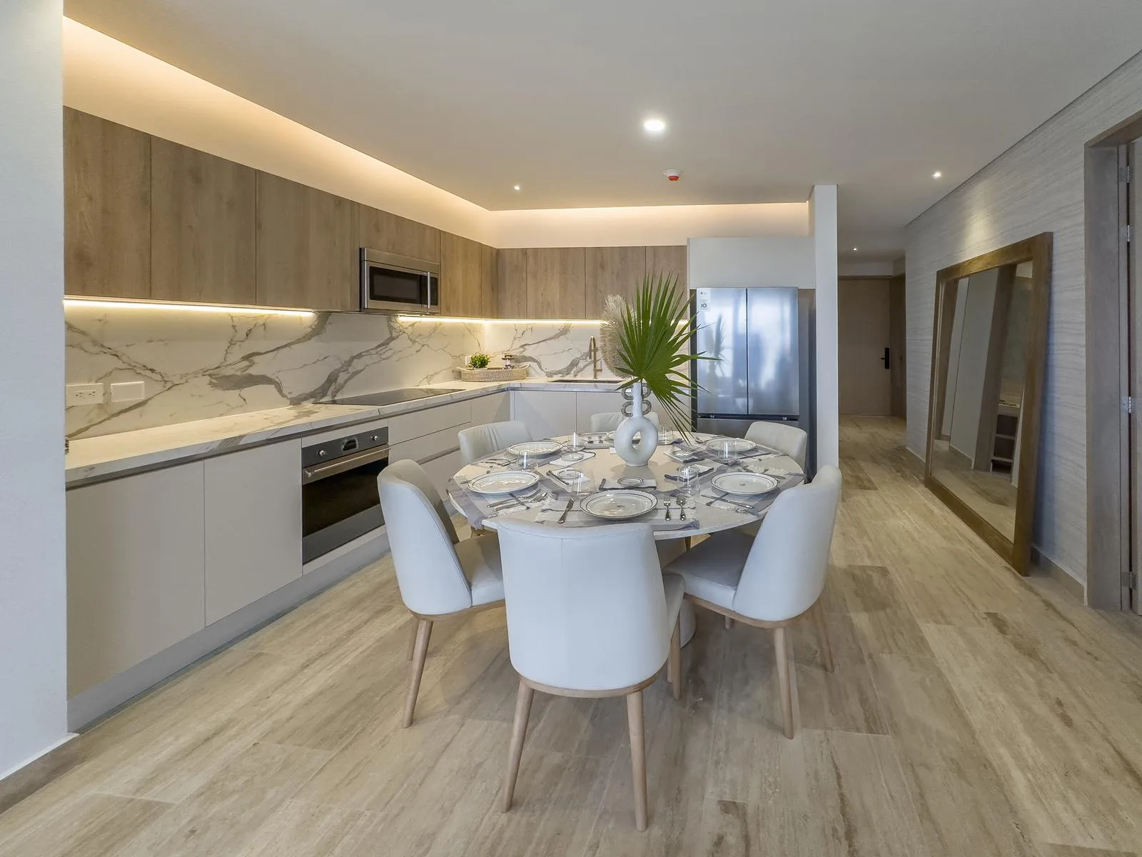 The building features a range of amenities. These include a rooftop pool with sea views, a solarium, a pool bar, and private beach access. Additional facilities include a coworking space, a gym, lounge pools, a lobby, and a BBQ area. The property is equipped with elevators, parking, bicycle parking, and CCTV security. It is pet-friendly and offers a meeting room and WiFi zones.