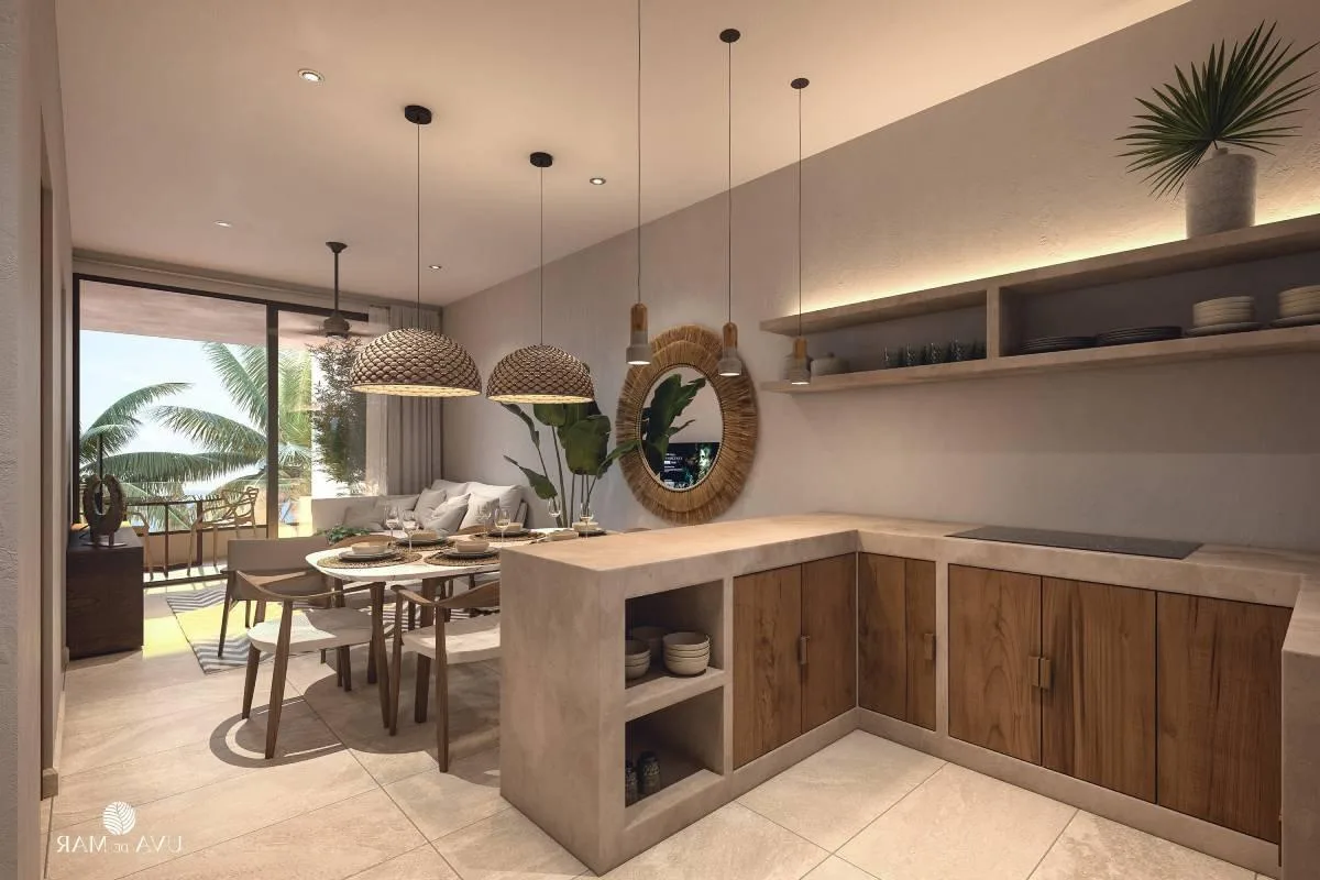 Two condominium models are available: Uva de Playa and Uva de la Costa. Both units feature 2 bedrooms, a private terrace, a dining room, a kitchenette with a breakfast bar, and 2 bathrooms. The Uva de Playa model measures 108. 05 square meters, while the Uva de la Costa model covers 102. 46 square meters.