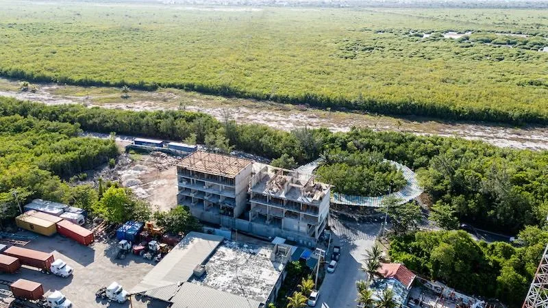 The location is highly convenient. It is approximately two minutes from supermarkets and essential services. The beach and private clubs are roughly five minutes away, while a golf club is about ten minutes away. The Cancun International Airport is approximately a 15-minute drive. The property also offers quick access to the Tren Maya and the Ruta de los Cenotes.