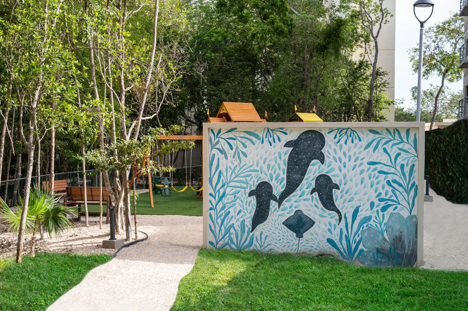 The residential complex offers more than 30 amenities. These include a climate-controlled gym, a sports bar, a lounge area with sunbeds, a pickleball court, and three swimming pools. Additional amenities consist of coworking spaces, wellness areas, and a game room.