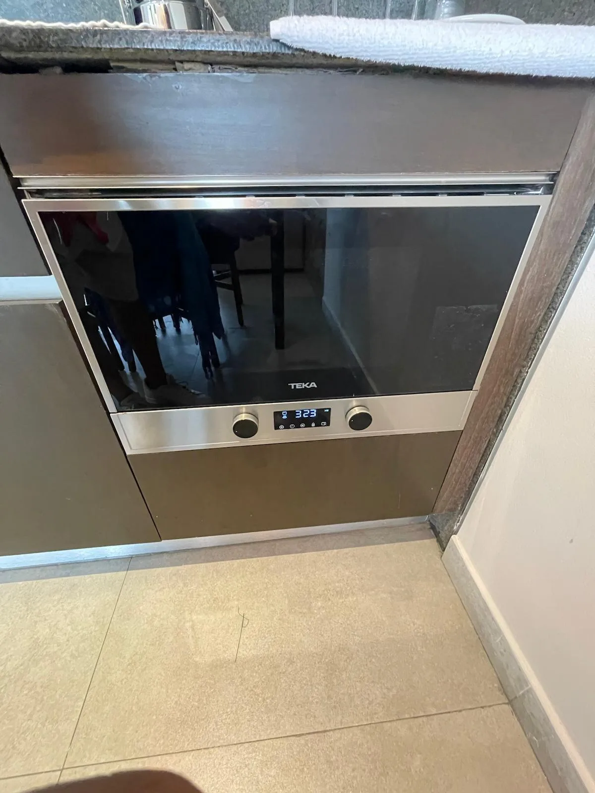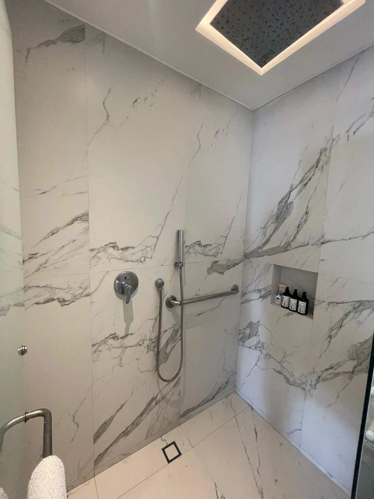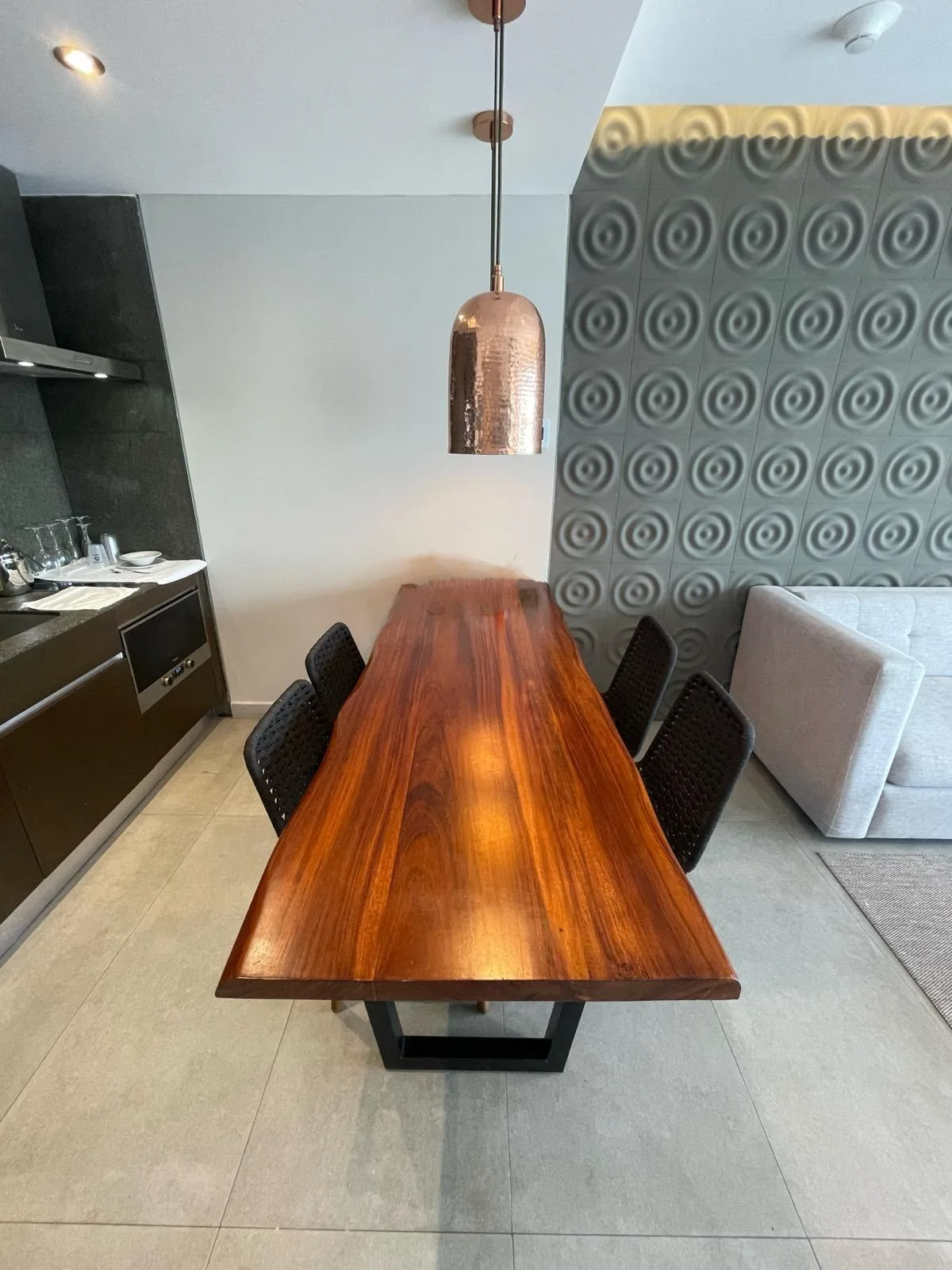 The apartment features one bedroom and one bathroom within an open-concept layout that integrates the living and dining areas. The kitchen is fully equipped, and the finishes are modern. The primary bedroom includes a king-size bed and an ensuite bathroom.